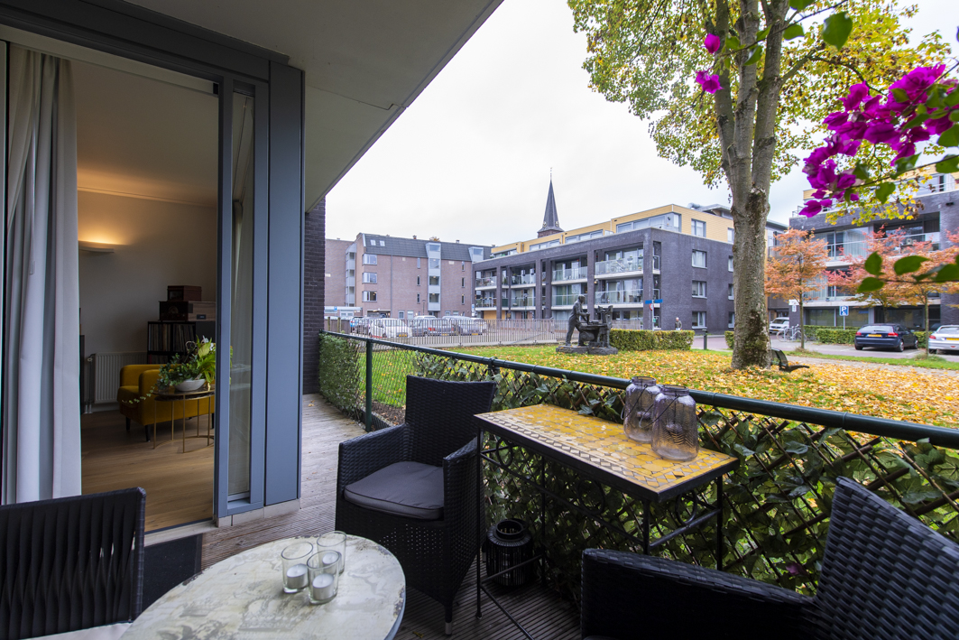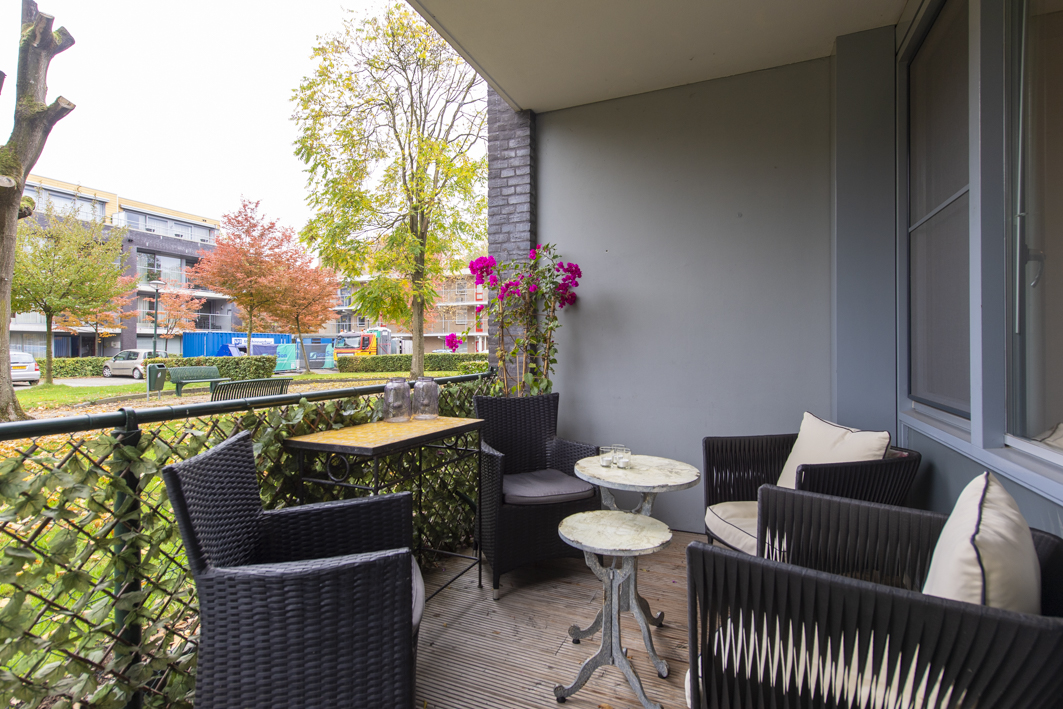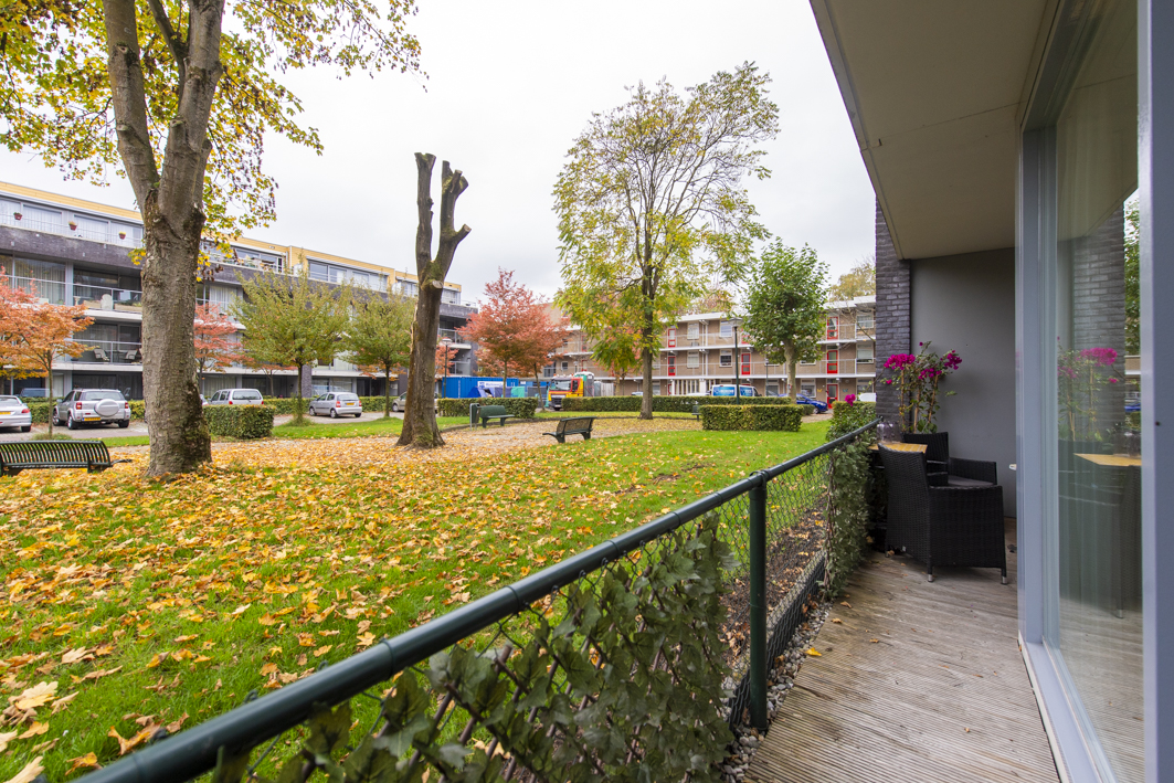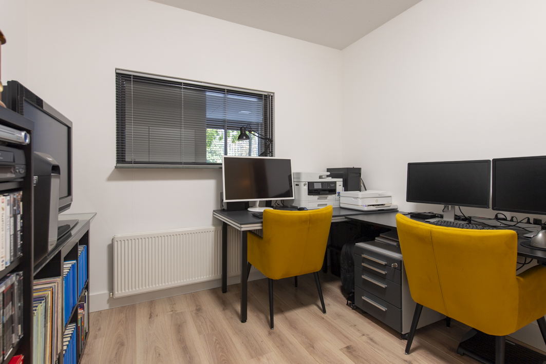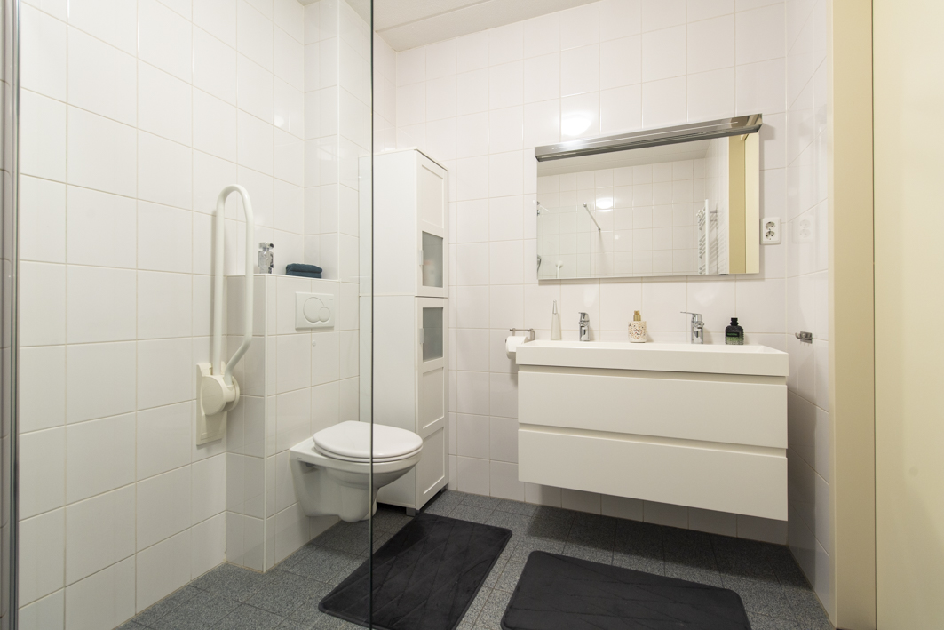 Aan de achterzijde bevindt zich de ruime tweede slaapkamer, met een fraai uitzicht op het overdekte balkon en het park. De kamer is afgewerkt met een laminaatvloer, stucwerk wanden en een spuitwerk plafond. De kozijnen zijn voorzien van horren en recent is er een airconditioning (2025) geplaatst die zowel kan koelen als verwarmen. Spullen kunnen opgeborgen worden in een moderne kast van Goossens meubelen met schuifdeuren (2022).