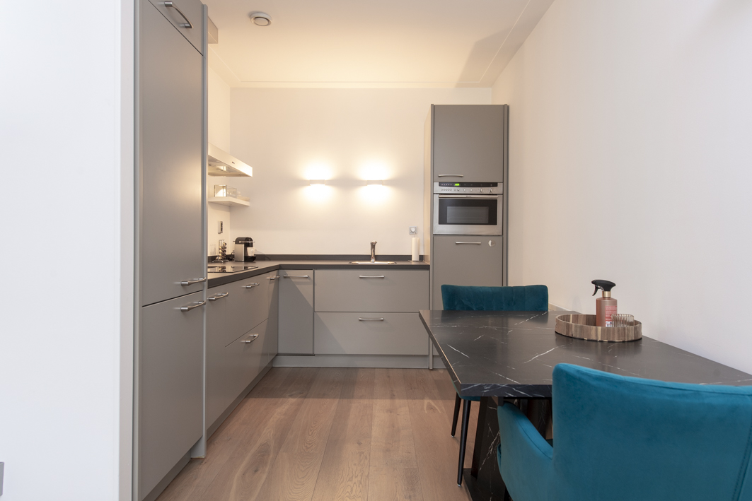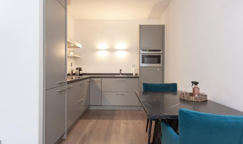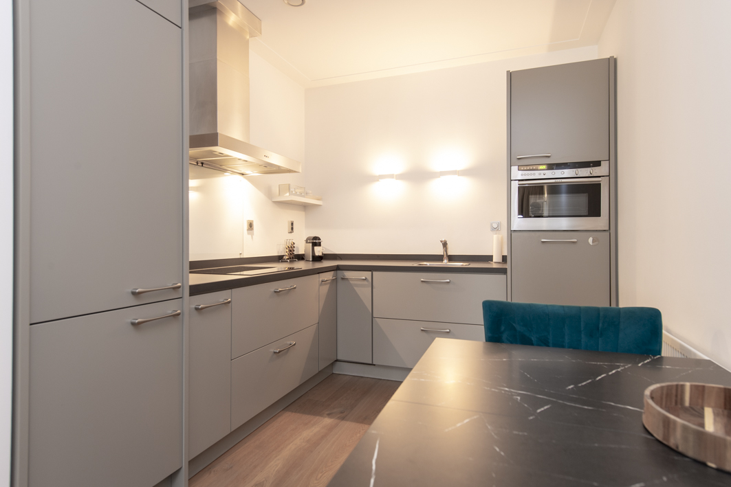 De half-open keuken is in een hoekopstelling geplaatst en beschikt over een vaatwasser op hoogte, een vrij nieuwe koel- vriescombinatie (2024), een 4-pits inductie kookplaat, een afzuigkap, een hete luchtoven en sfeervolle wandverlichting.