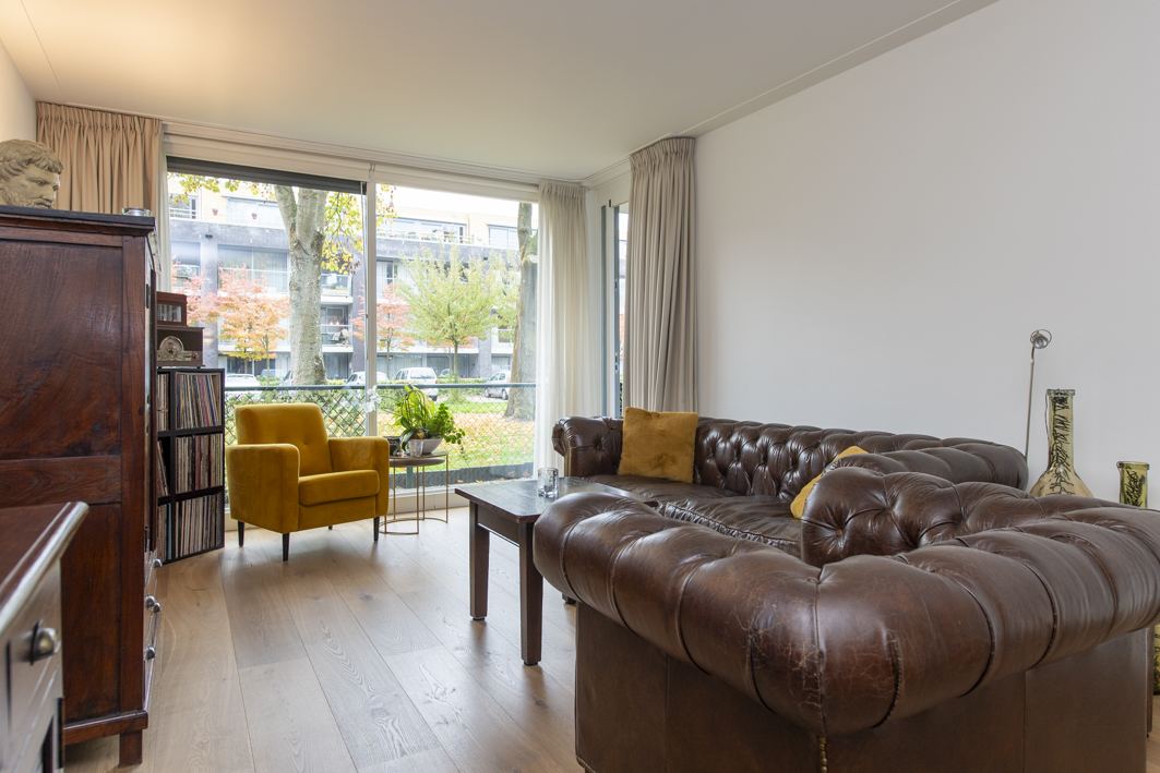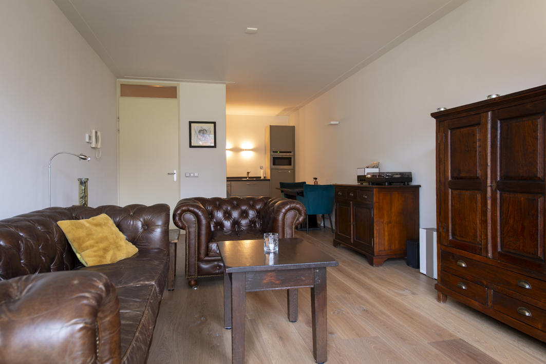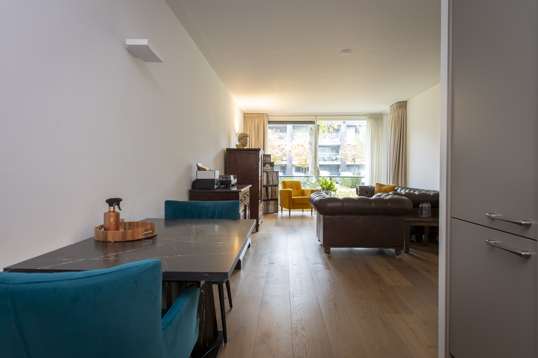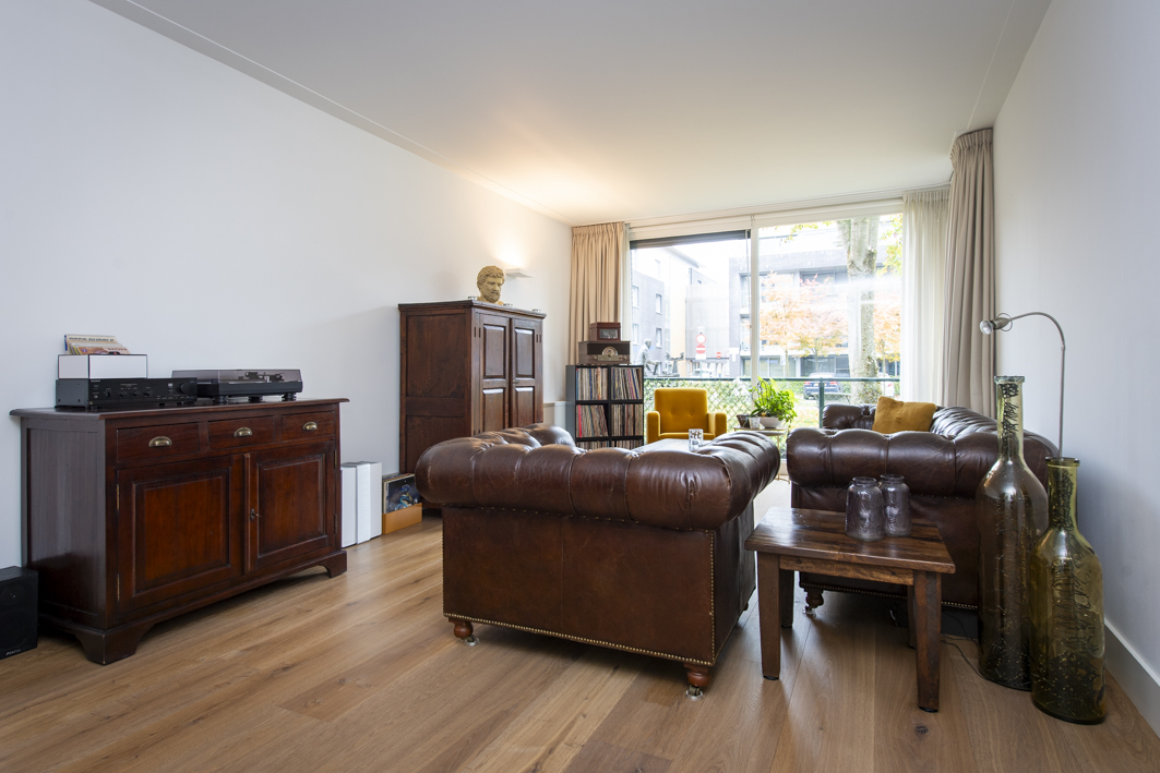 De woonkamer geniet van veel lichtinval dankzij de grote ramen en de deur naar het balkon. Net als de gang is de woonkamer afgewerkt met een houten vloer (2022), terwijl de wanden en het plafond zijn voorzien van strak stucwerk met een sierlijst. Daarnaast is de woonkamer eveneens voorzien van een airconditioning (2025), wat zorgt voor een aangenaam klimaat in alle seizoenen.