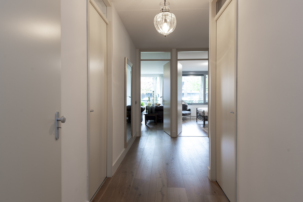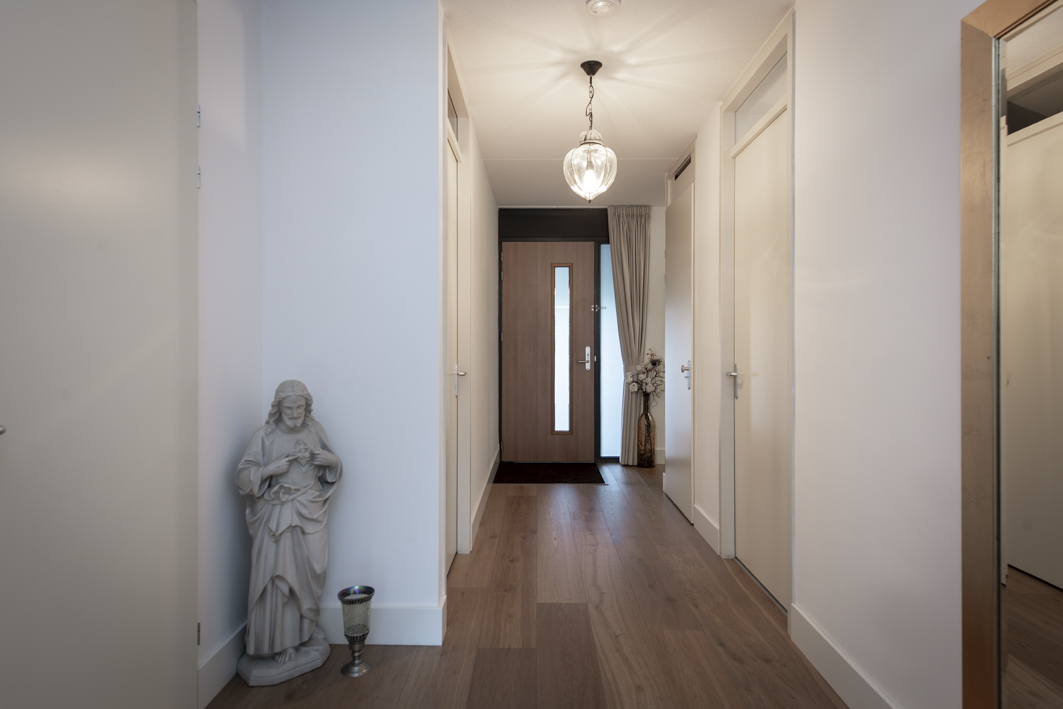 Vanuit de entree/gang met garderobewand zijn alle vertrekken bereikbaar. De gang beschikt over een meterkast en is afgewerkt met een zeer nette houten vloer (2022), stucwerk wanden en spuitwerk plafonds.
