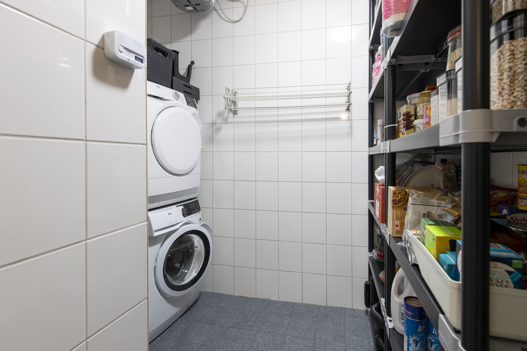 Vanuit de gang is ook de inpandige bergruimte met opstelling combiketel (Remeha, 2017), mechanische ventilatie, alsmede de wasmachine- en drogeraansluiting.