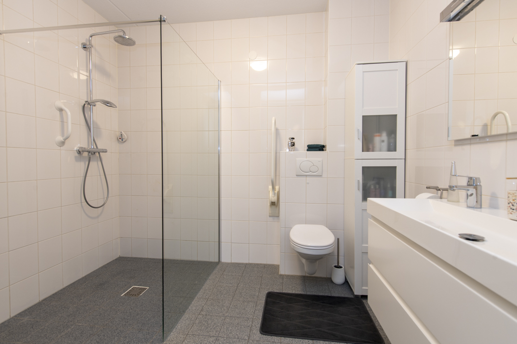De royale, geheel betegelde badkamer is praktisch ingericht middels een ruime inloopdouche, wandcloset, designradiator en een dubbele wastafel met meubel en spiegel met verlichting.