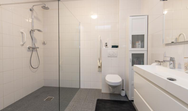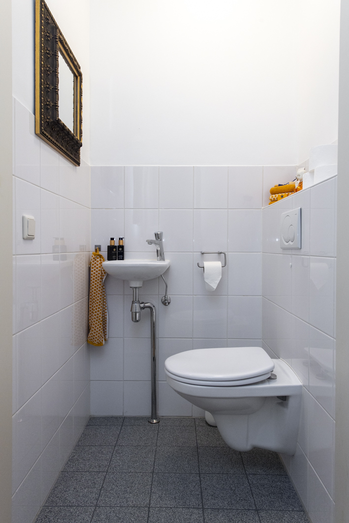 Aan de voorzijde is de deels betegelde toiletruimte met wandcloset en fonteintje gesitueerd.