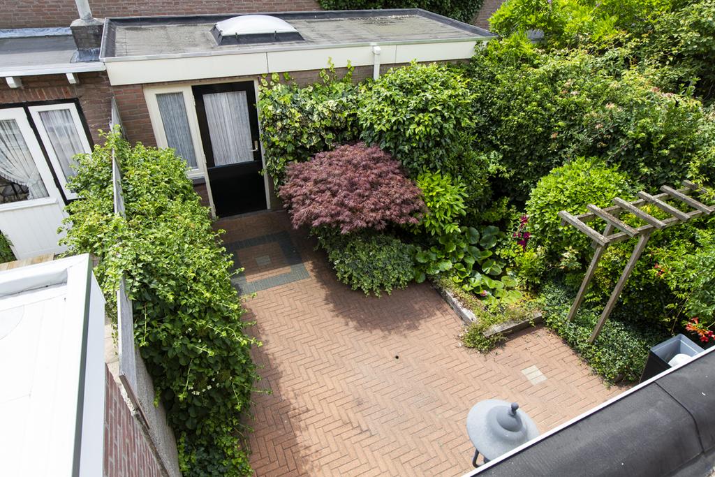 De woning heeft een fijne groene voortuin, waardoor er sprake is van privacy in de woning. De op het zuiden gelegen groene achtertuin is ingericht met bestrating, een vijver, klimhortensia’s, trompetstruik en borders. Er is een royale (over de gehele breedte) stenen berging (in spouw met isolatie en verwarming) met lichtkoepel en aan/afvoer wasmachine. Een deur geeft toegang tot de achtergelegen brandgang naar de straat.