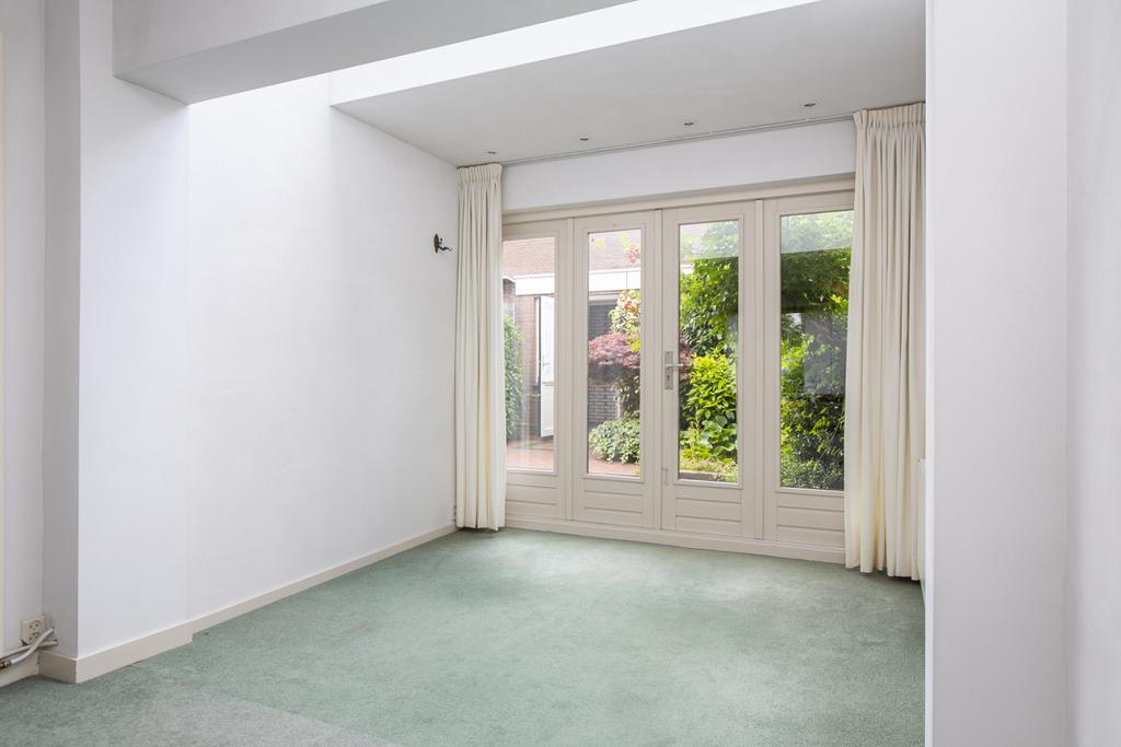 De woonkamer is uitgebouwd, heeft een lichtstraat, een schoorsteenkanaal- met een elektrische kachel- en openslaande deuren naar de achtertuin. De gesloten keuken (open keuken mogelijk) is voorzien van een beige/bruine keukeninrichting met 2 spoelbakken, vaatwasser, 4-pitsgaskookplaat, afzuigkap, oven en koelkast. Een deur geeft toegang tot de achtertuin.