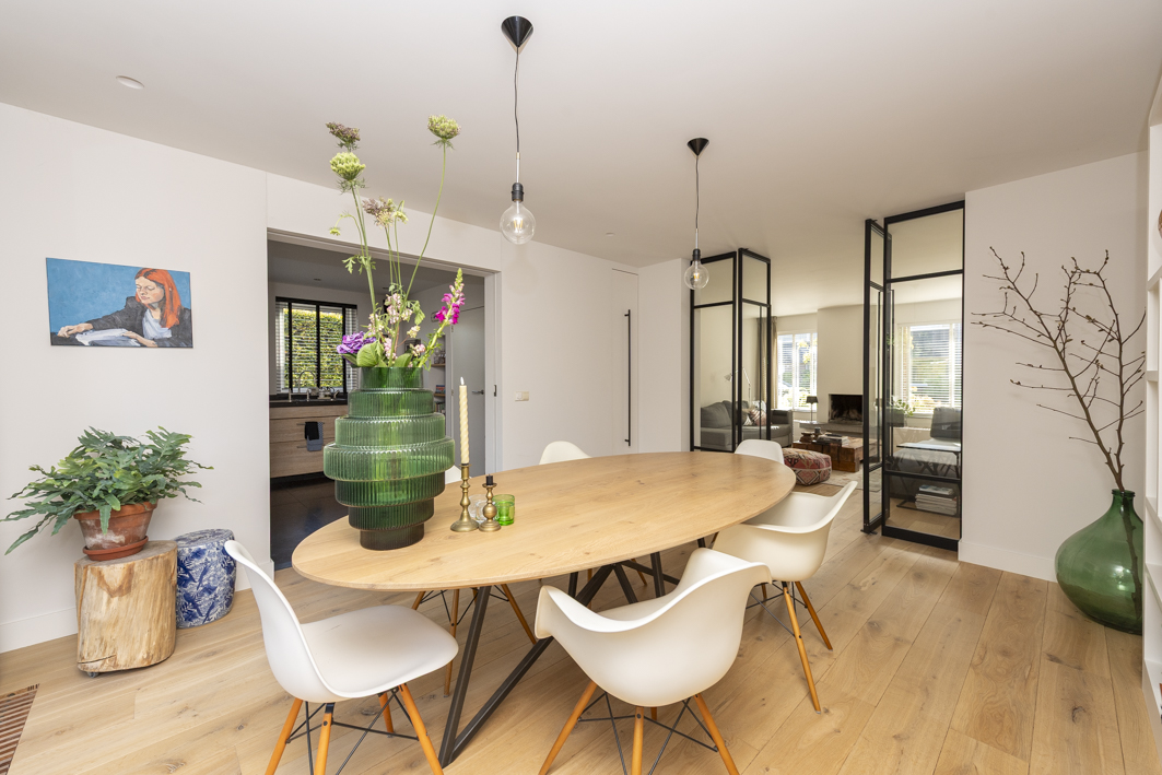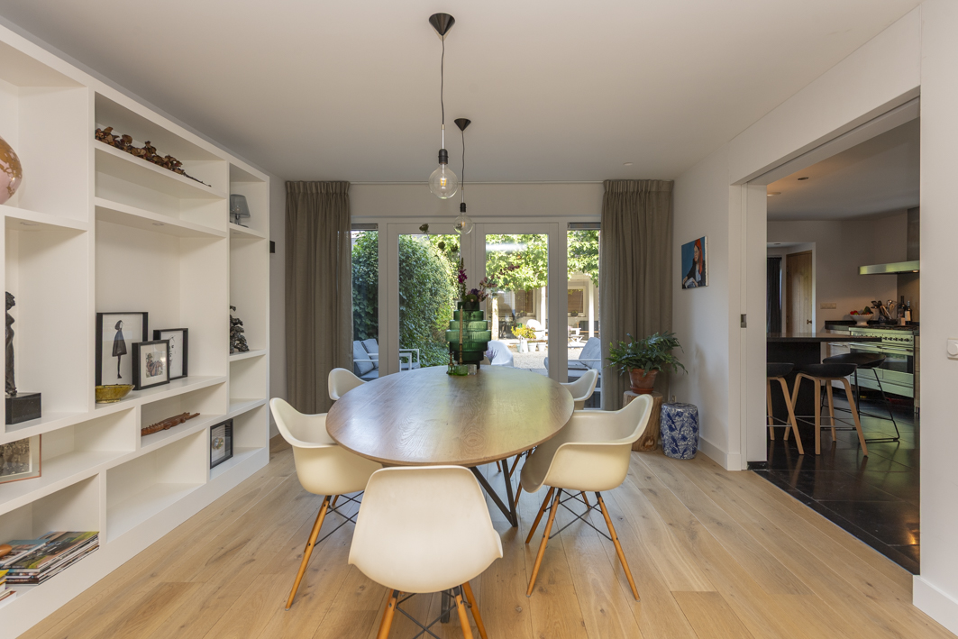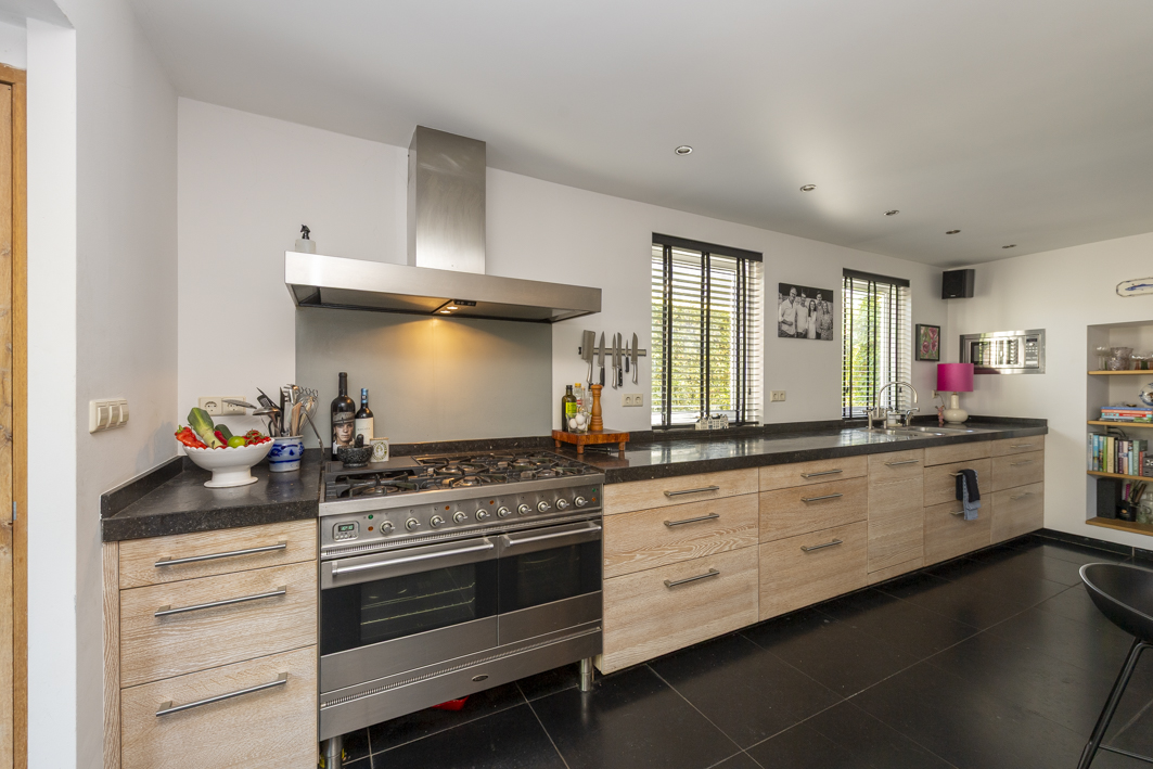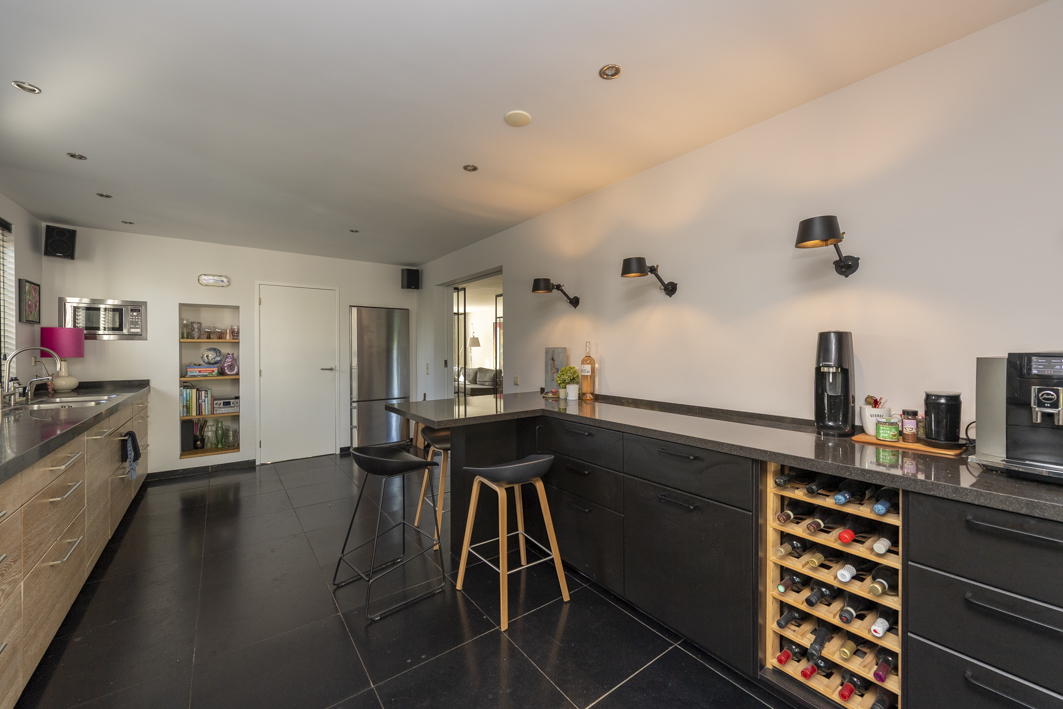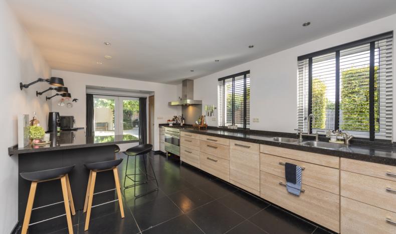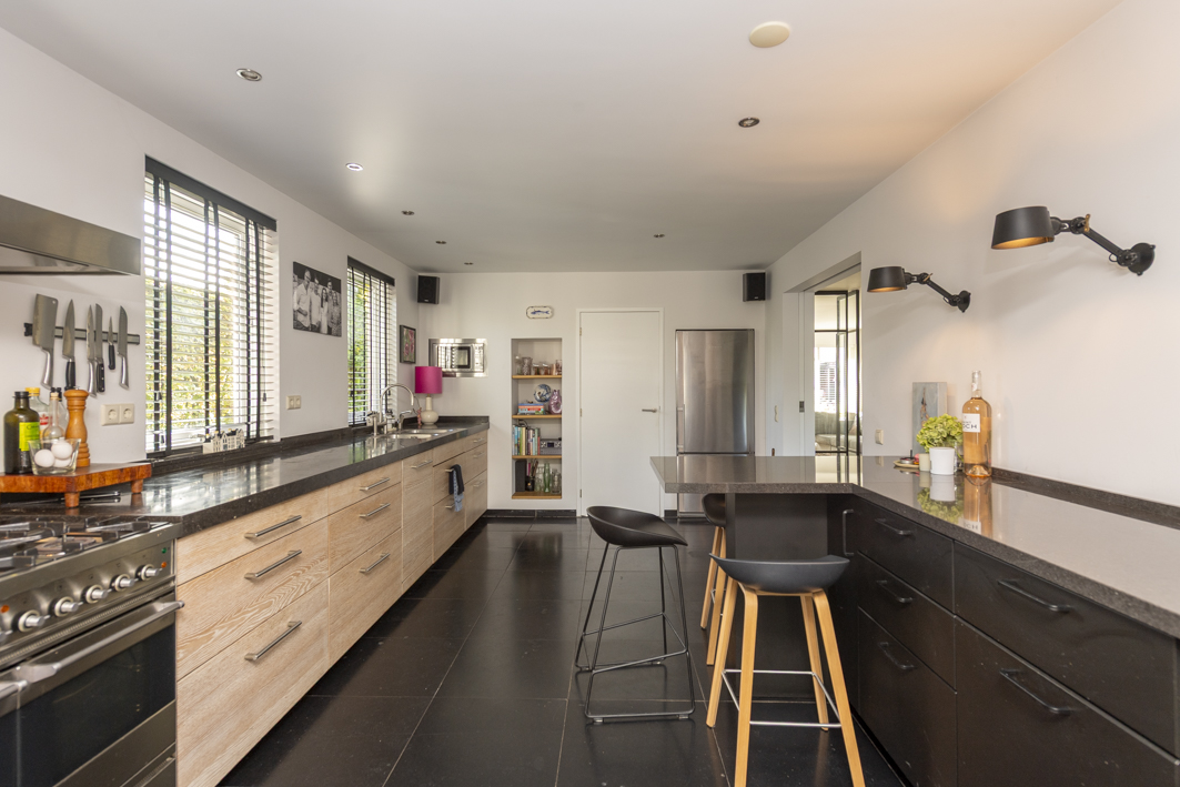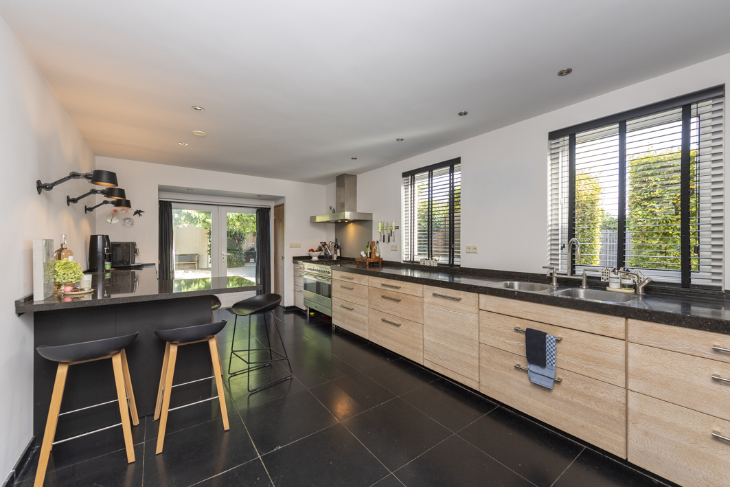 • Luxe open keuken met bar en diverse inbouwapparatuur (o.a. Boretti-fornuis, Quooker) en tuindeuren.