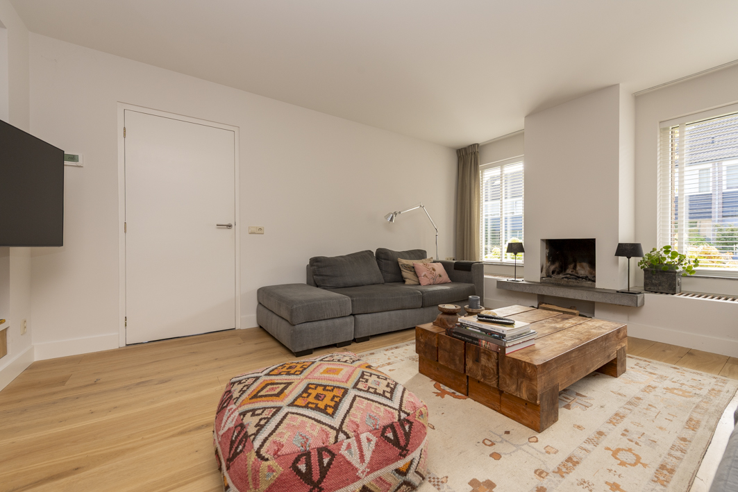 • Sfeervolle living met open haard, maatwerk wand- en schuifkasten en tuindeuren.