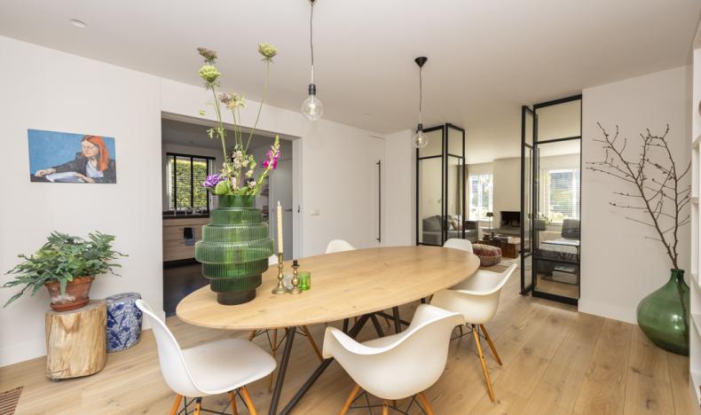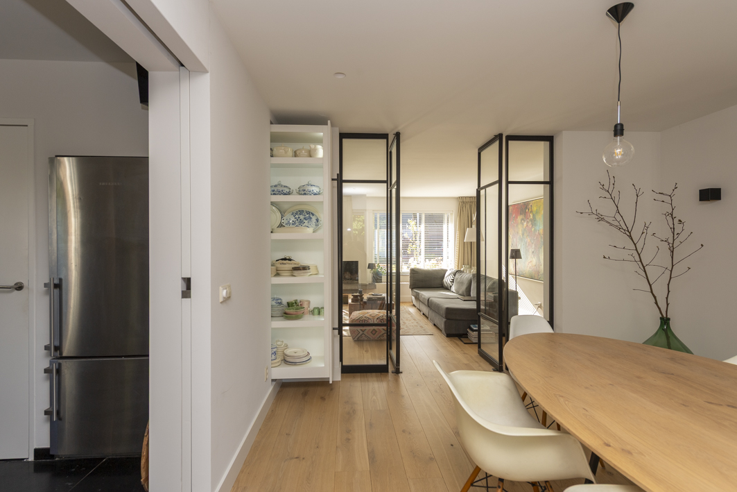 Entree via de zijtuin naar de ruime hal met garderobe, toiletruimte met fontein, trapopgang en toegang tot het souterrain. Sfeervolle living, bestaande uit een woonkamer met open haard en middels stalen taatsdeuren – met maatwerkkasten ombouw- te bereiken eetkamer met vakkenkast en tuindeuren. Middels schuifdeuren toegang tot de semi-open keuken met eveneens tuindeuren. Deze gezellige keuken is ingericht met een modern massief houten keukenblok met Belgisch hardstenen werkblad met veel lades, 2 spoelbakken, een Boretti fornuis met dubbele oven, Quooker, vaatwasser, een nis met magnetron en een nis met losse koel-vriescombinatie. Verder is een zitbar met veel lades en zijn er vaste kasten. Een fijne plek om te borrelen en dineren met familie en vrienden en samen de dag doornemen tijdens het koken.