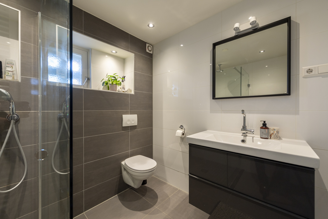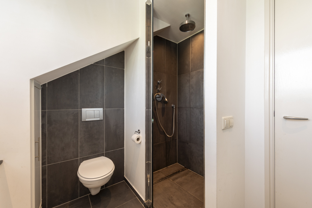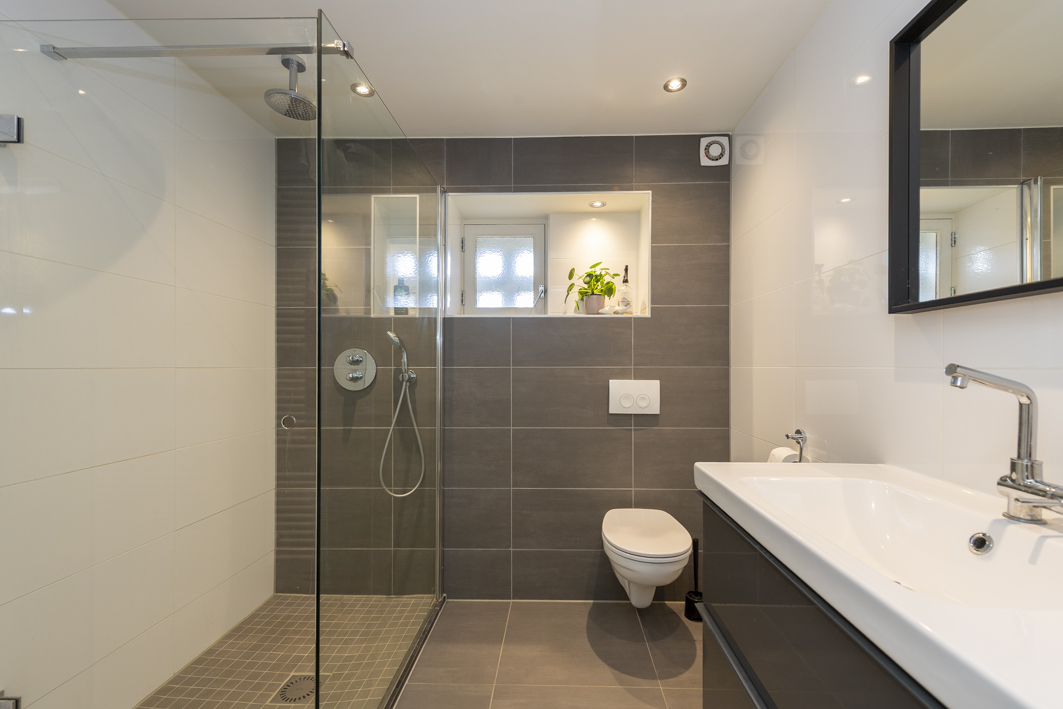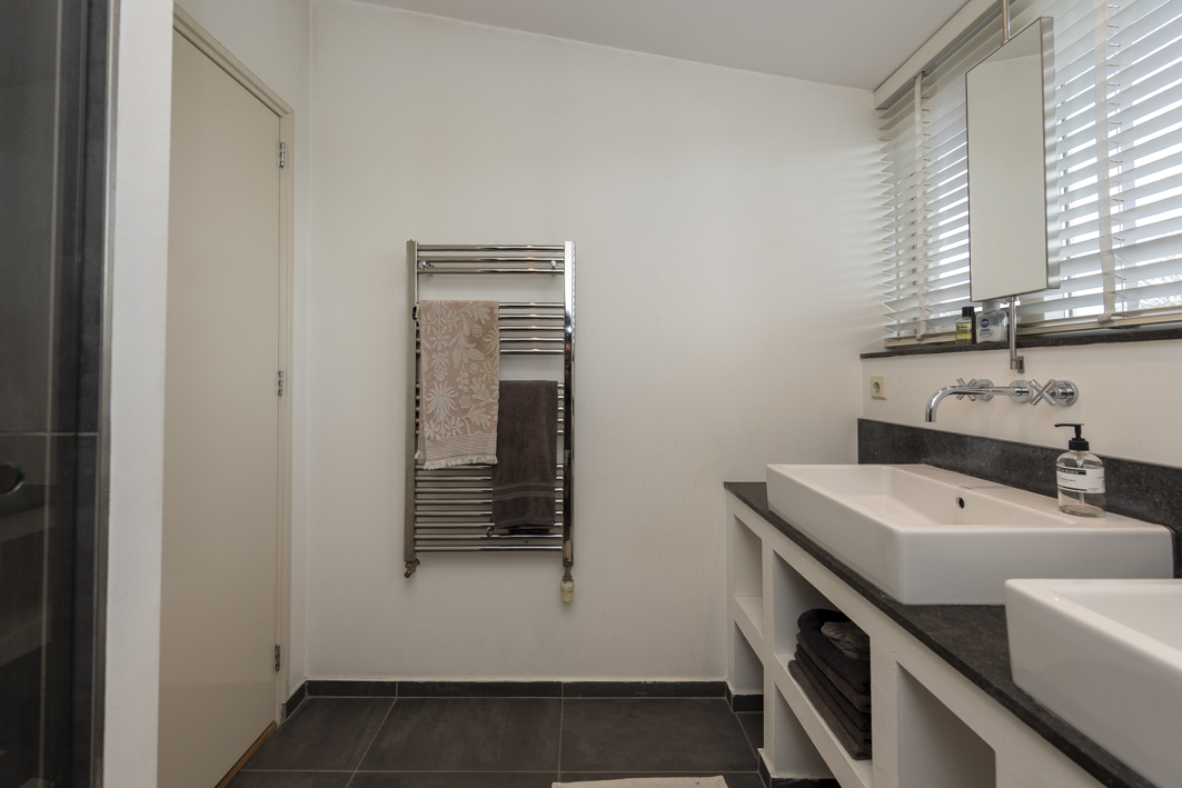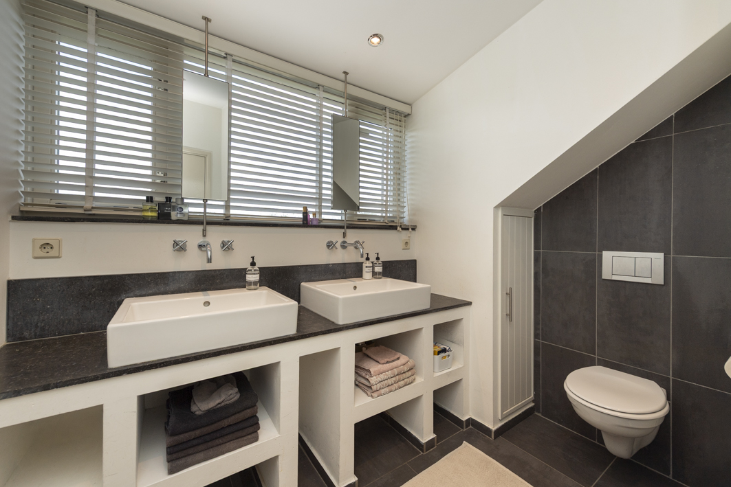 Ruime ouderslaapkamer met 2 dakramen v.v. zonnewering, eigen kleedruimte en een inloopkast. Verder is er toegang naar de eigen moderne badkamer voorzien van een inloopdouche (met stort-en handdouche), 2 wastafels op meubel en toilet (met sanibroyeur). Deze badkamer heeft vloerverwarming. Daarnaast zijn er twee royale bergingen, waarvan één met vliering en één met opstelling c.v.-combiketel