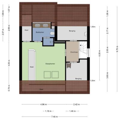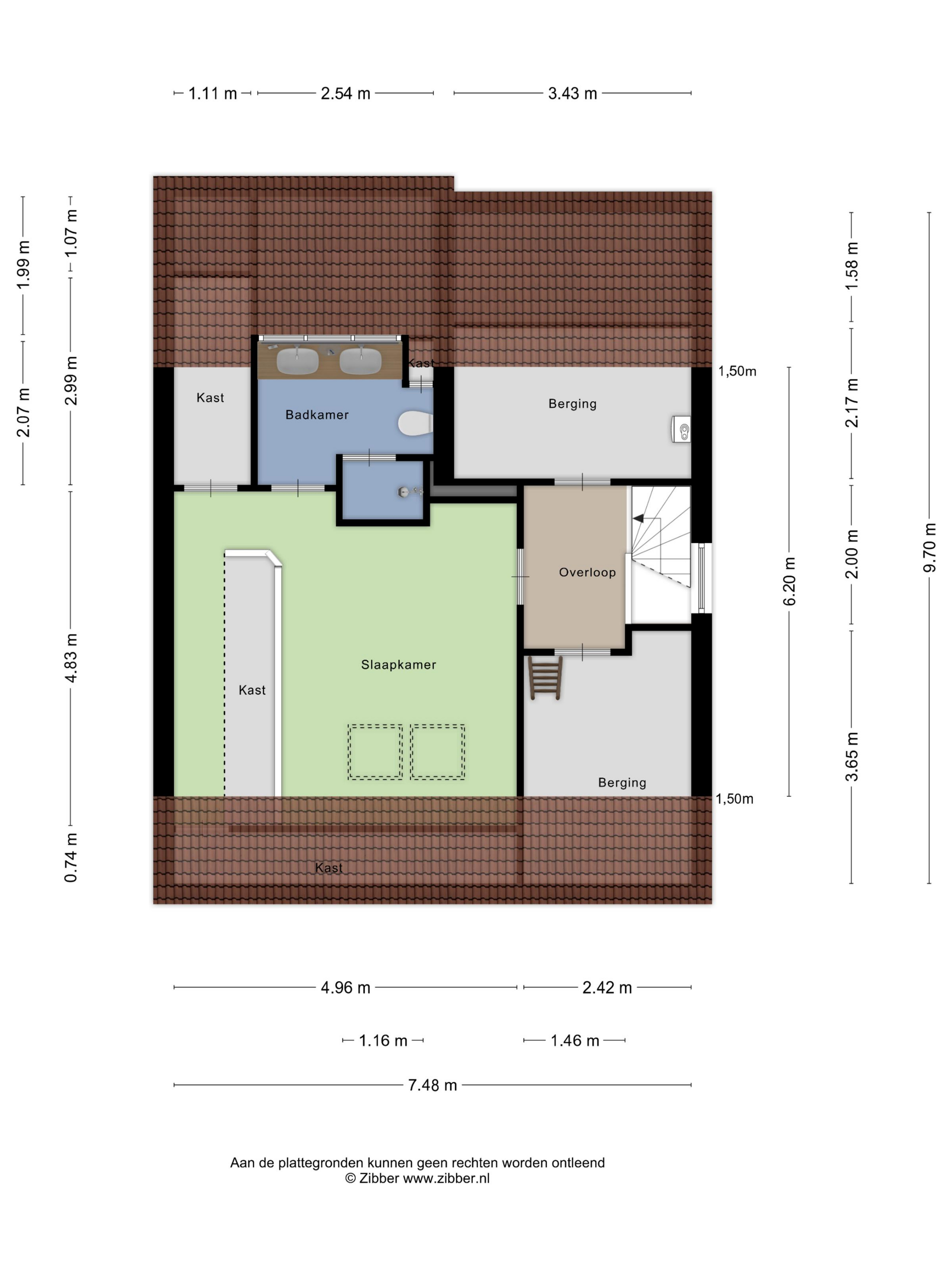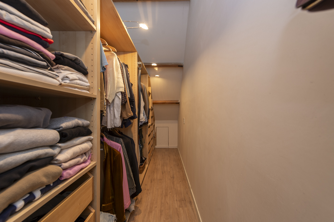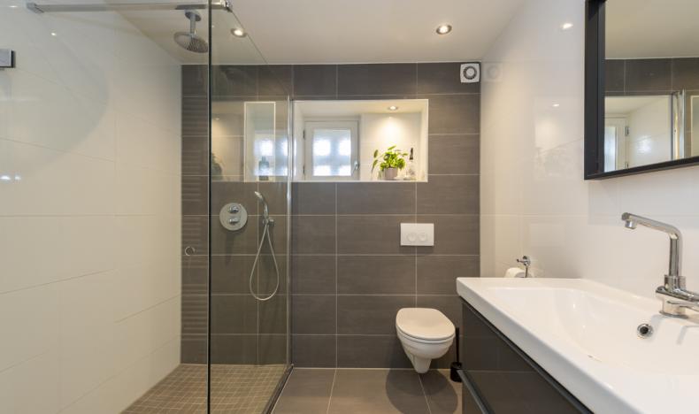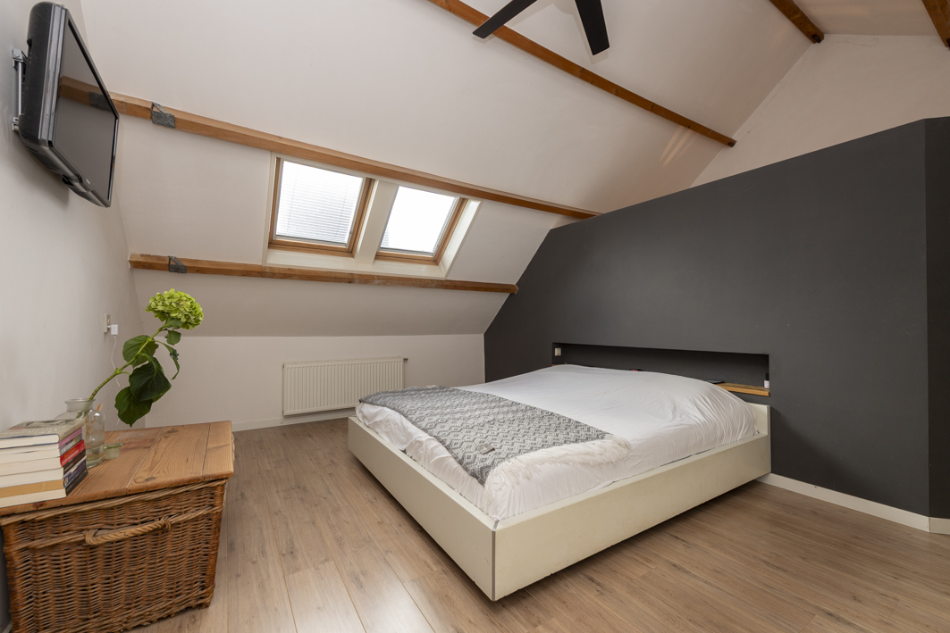 Ruime ouderslaapkamer met 2 dakramen v.v. zonnewering, eigen kleedruimte en een inloopkast. Verder is er toegang naar de eigen moderne badkamer voorzien van een inloopdouche (met stort-en handdouche), 2 wastafels op meubel en toilet (met sanibroyeur). Deze badkamer heeft vloerverwarming. Daarnaast zijn er twee royale bergingen, waarvan één met vliering en één met opstelling c.v.-combiketel