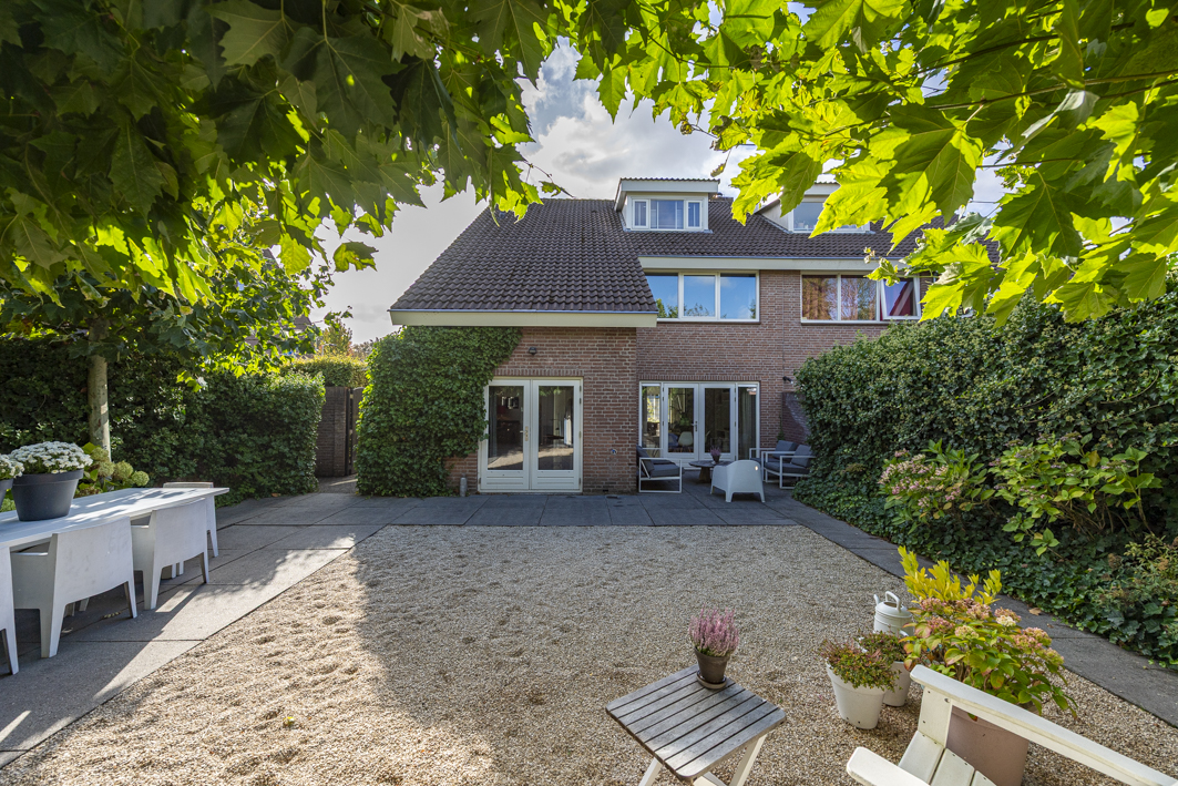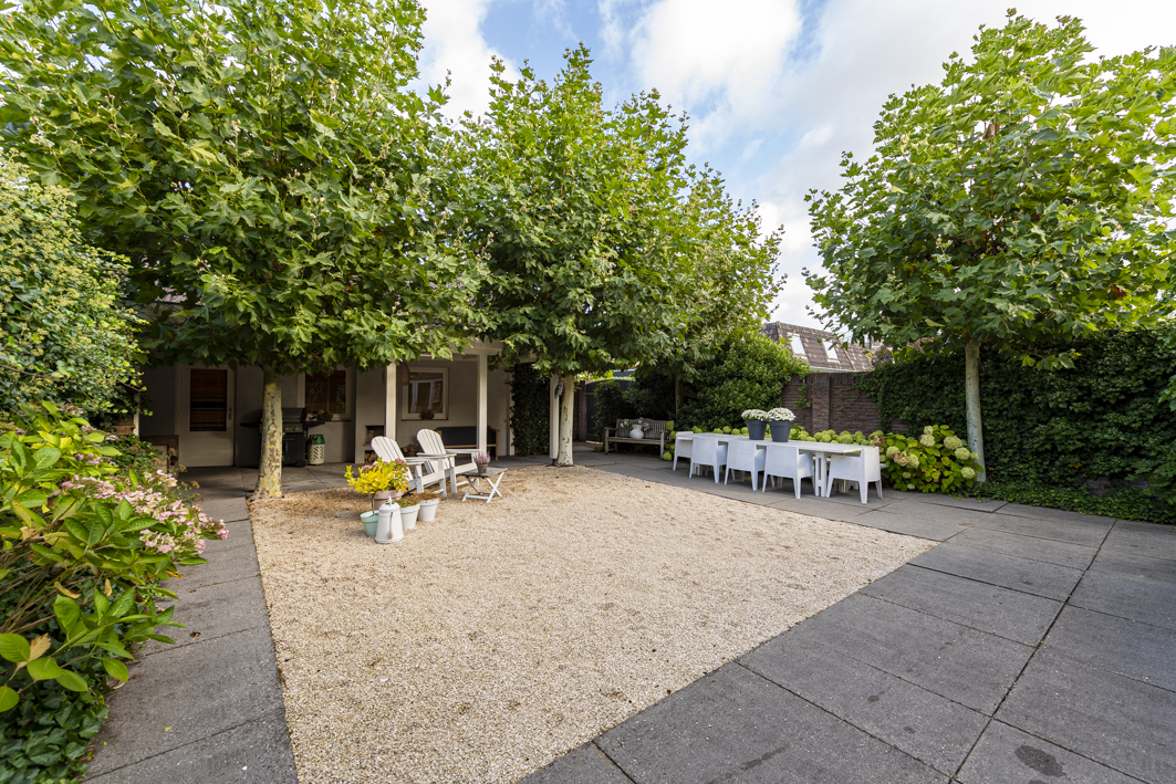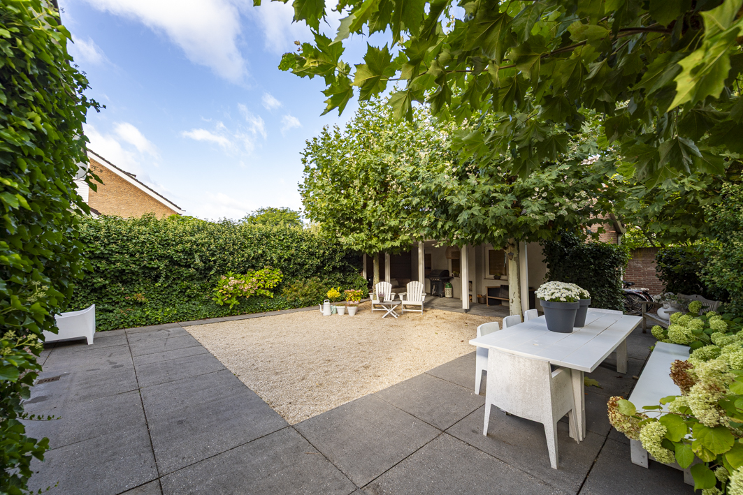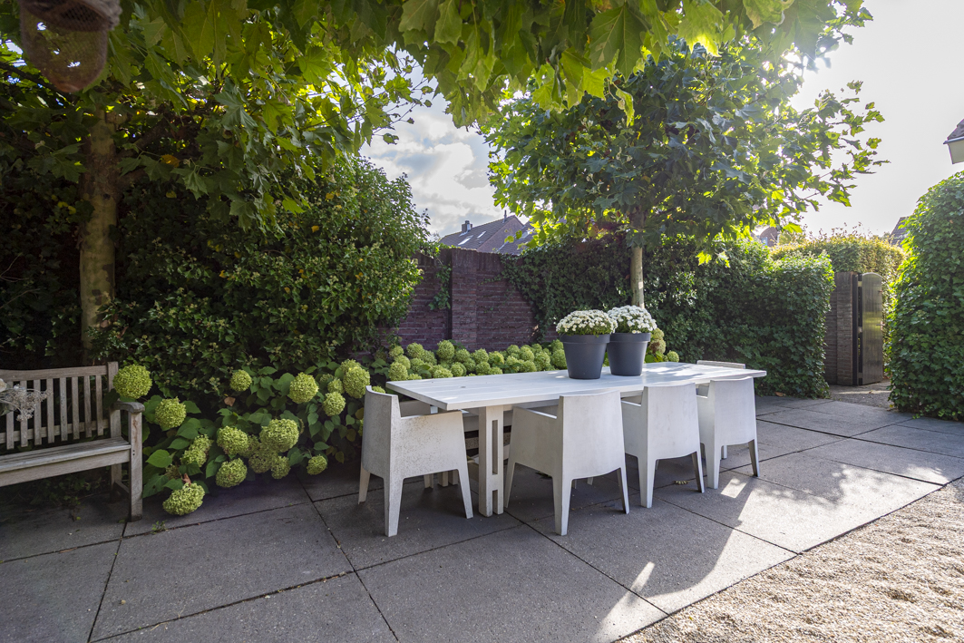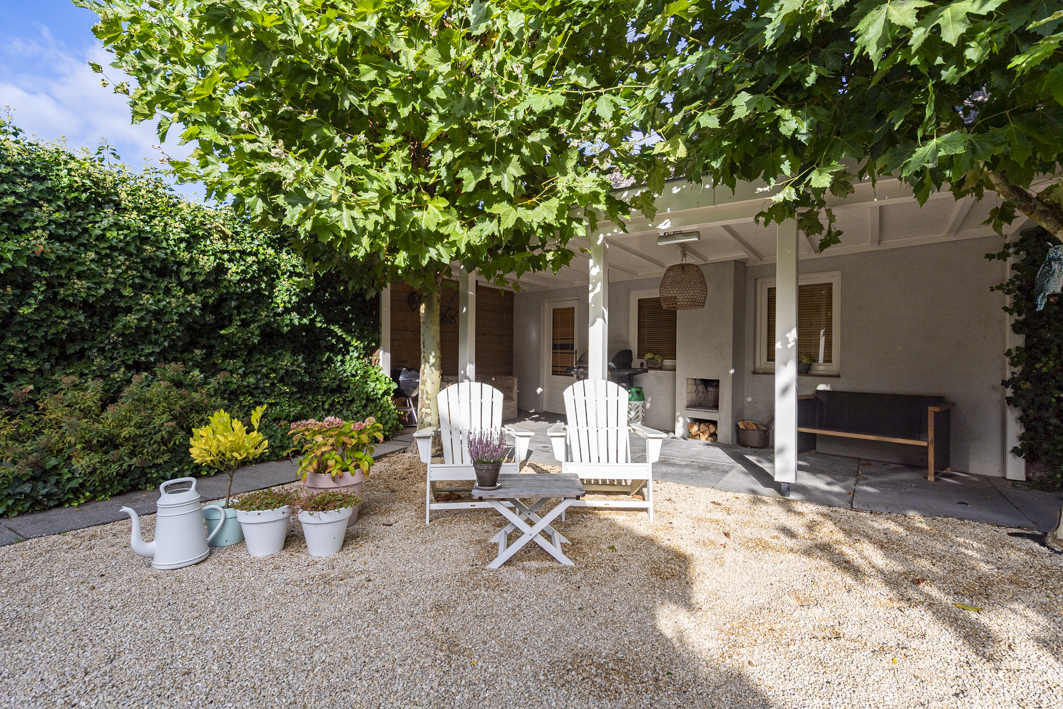 De achtertuin ligt op het noordwesten en is fraai aangelegd met een terras bij de woonkamer, platanen, hortensia’s, siergrind en een sfeervolle loungehoek met open haard. De voortuin en zijtuin bieden een groene buffer naar de straat. Een dubbele poort geeft vanaf de straat toegang tot de oprit voor de vrijstaande garage met een roldeur, een loopdeur, 2 ramen, een smeerput, elektra en een ruime bergzolder.