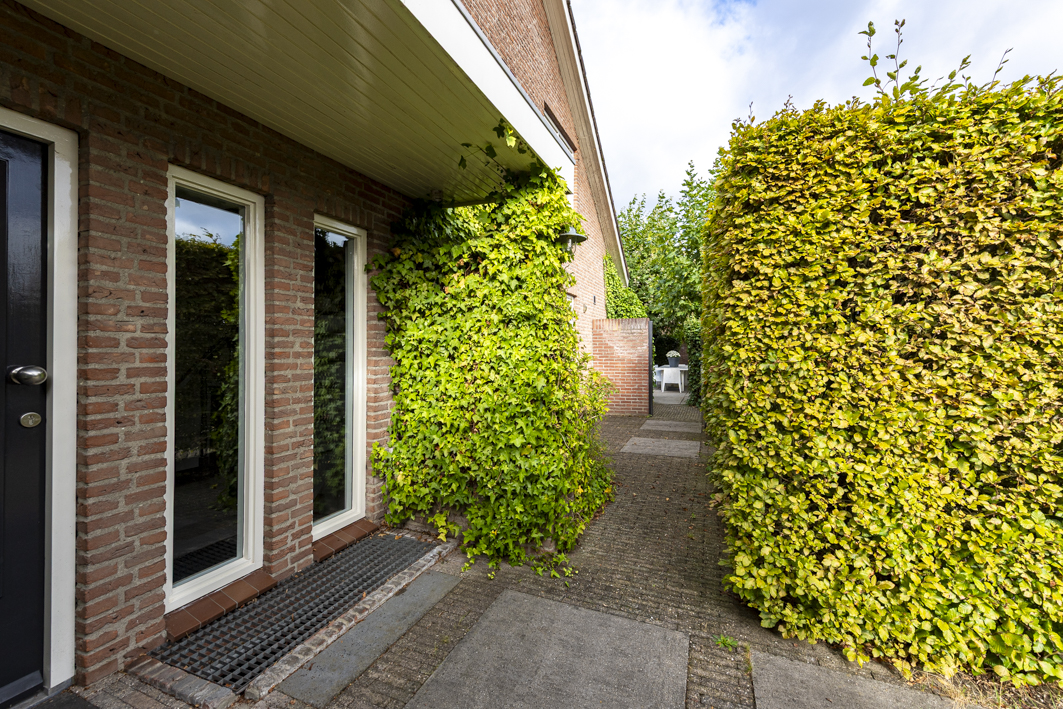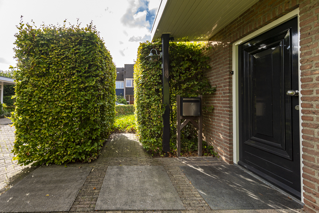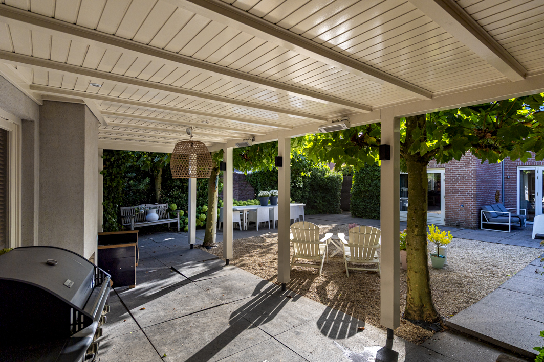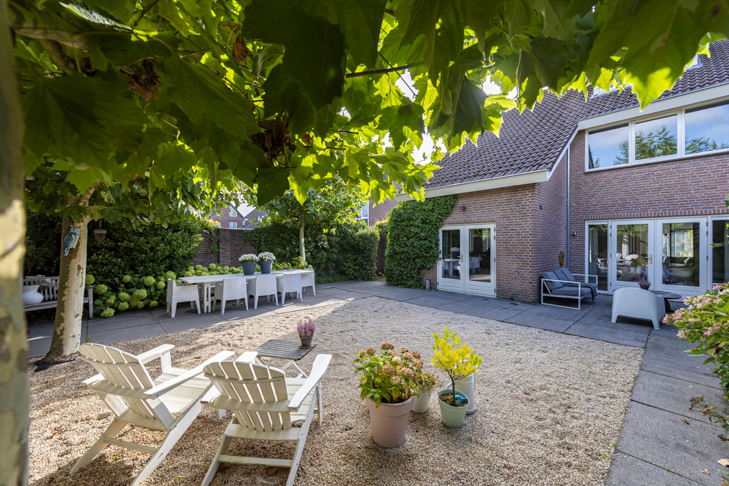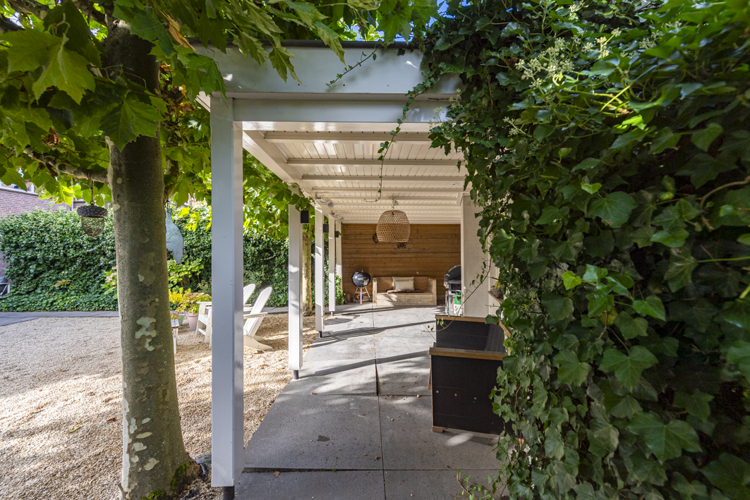 De achtertuin ligt op het noordwesten en is fraai aangelegd met een terras bij de woonkamer, platanen, hortensia’s, siergrind en een sfeervolle loungehoek met open haard. De voortuin en zijtuin bieden een groene buffer naar de straat. Een dubbele poort geeft vanaf de straat toegang tot de oprit voor de vrijstaande garage met een roldeur, een loopdeur, 2 ramen, een smeerput, elektra en een ruime bergzolder.