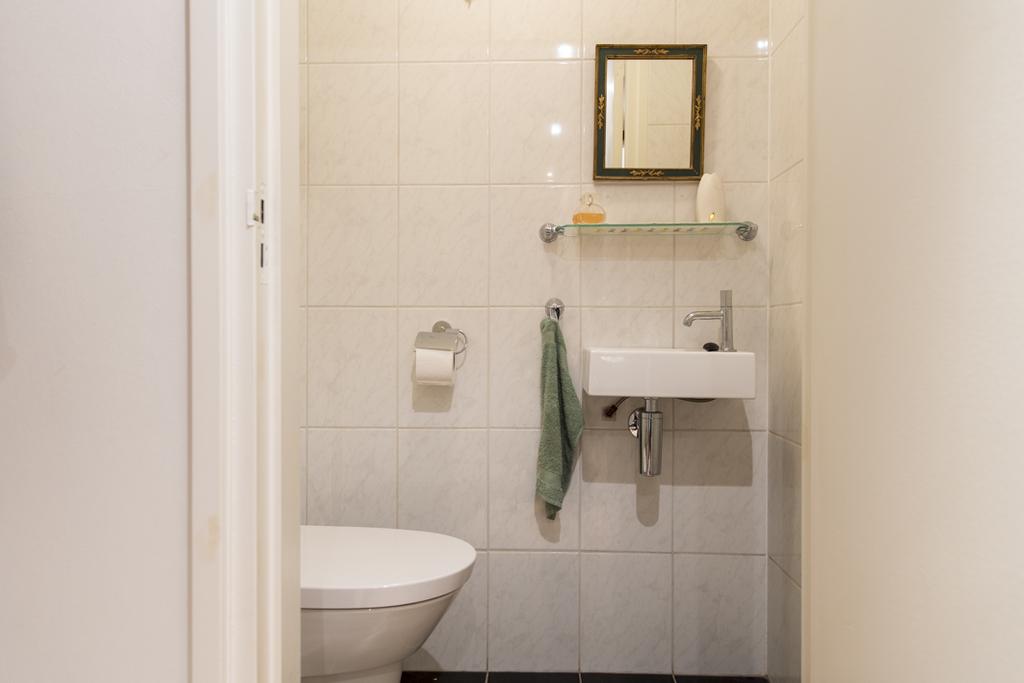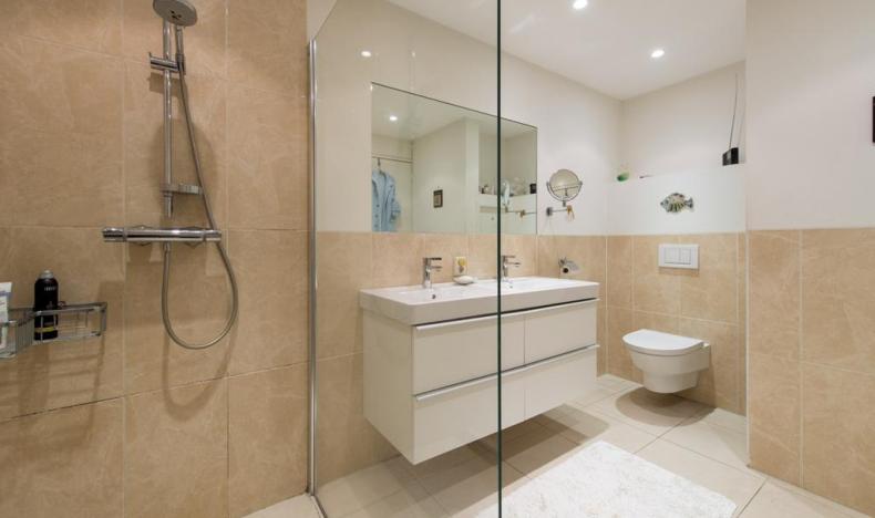 De badkamer bij het kantoor of de tweede slaapkamer is bereikbaar via een tussenhal voorzien van vaste kasten. Deze badkamer is eveneens volledig betegeld en voorzien van een hangcloset, ligbad en wastafel.