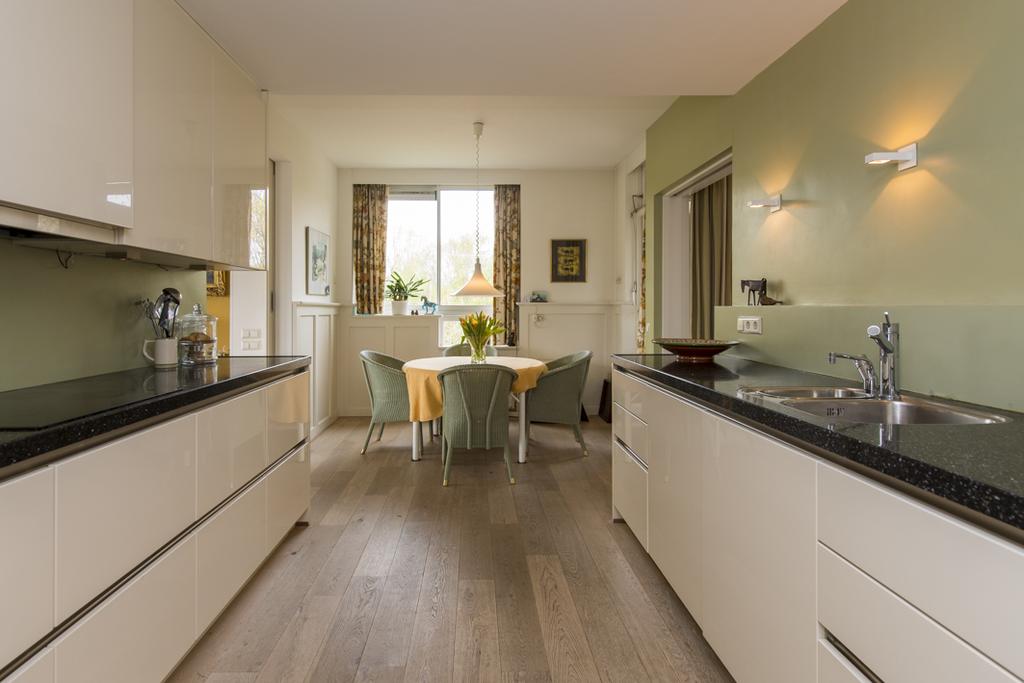 Naast de eetkamer bevindt zich een riante, halfopen woonkeuken bereikbaar door middel van en-suite deuren omringd met vaste kasten. De woonkeuken beschikt over twee strakke keukenblokken voorzien van hardstenen aanrechtblad en inbouwapparatuur te weten: koelkast, vriezer, vaatwasser, inductiekookplaat, afzuigkap en combimagnetron. Aansluitend aan de keuken grenst het kantoor of de tweede slaapkamer, bereikbaar via schuifdeuren. Via de keuken, de kantoorkamer en de hoofdslaapkamer toegang tot eenzelfde balkon. De hoofdslaapkamer is ook via de hal bereikbaar. De hoofdslaapkamer beschikt over diverse op maat gemaakte vaste kledingkasten en over een eigen badkamer voorzien van een inloopdouche, dubbele wastafel in meubel en een decorradiator. Tot slot beschikt de hoofdslaapkamer nog over toegang tot een eigen, klein, balkon.