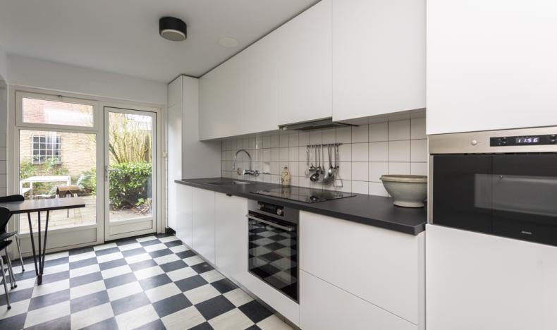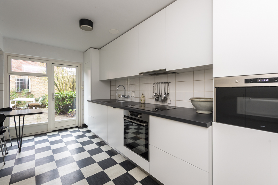 Aan de achterzijde van de woning bevindt zich de gemoderniseerde woonkeuken (2020), een fijne plek om samen te koken en te eten. De woonkeuken is uitgerust met witte onder- en bovenkasten, een vaste eettafel, ATAG-inbouwapparatuur (inductiekookplaat, afzuigkap, oven en magnetron), een AEG was-droogcombinatie en een AEG-koelkast met groentelades en vriesvak. De LED-verlichting onder de bovenkasten en het donkergrijze composiet aanrechtblad maken het strakke keukenblok compleet. Vanuit de woonkeuken heeft u direct toegang tot de charmante tuin met borders.