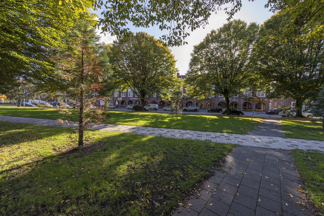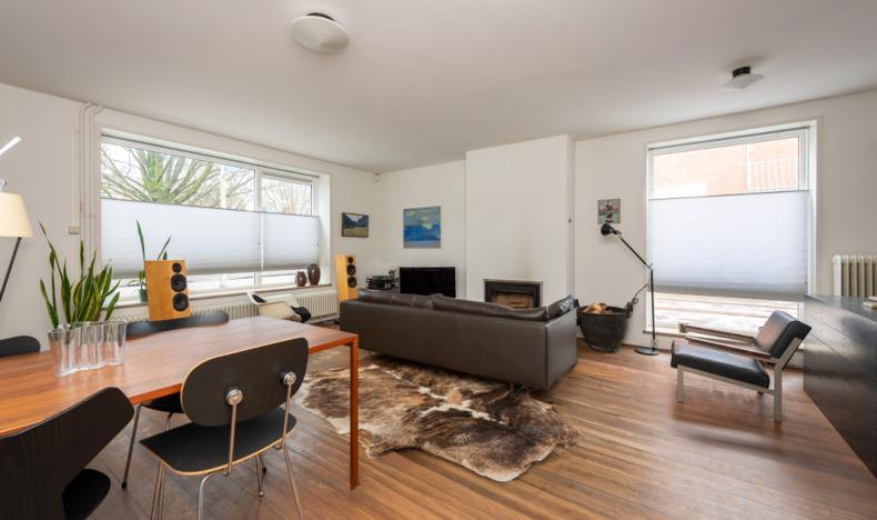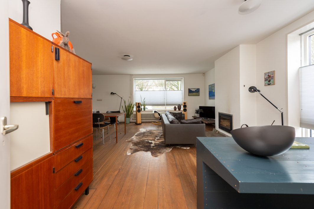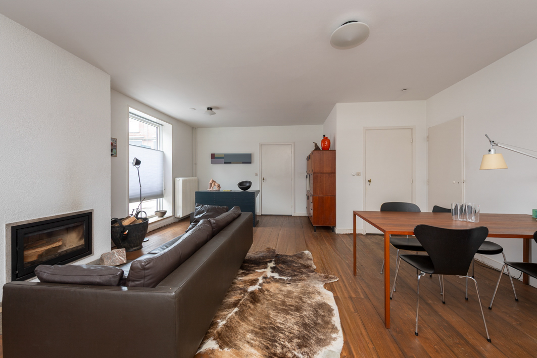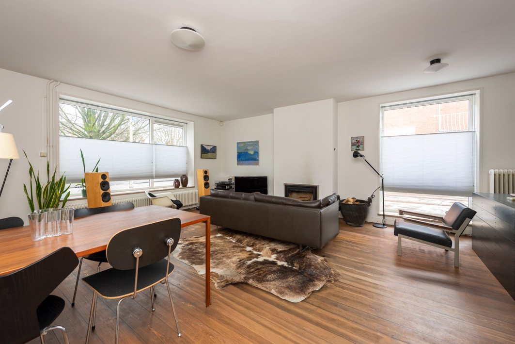 De lichte woonkamer (circa 35 m²) biedt een prachtig, vrij uitzicht over het Van de Mortelplein. De ruimte, met een plafondhoogte van 2,58 m, is afgewerkt met een houten vloer en strak stucwerk en beschikt over een sfeervolle schouw met inbouwhoutkachel. Karakteristiek zijn de twee grote raamkozijnen, met extra diepe vensterbanken, die iets buiten de gevel steken.