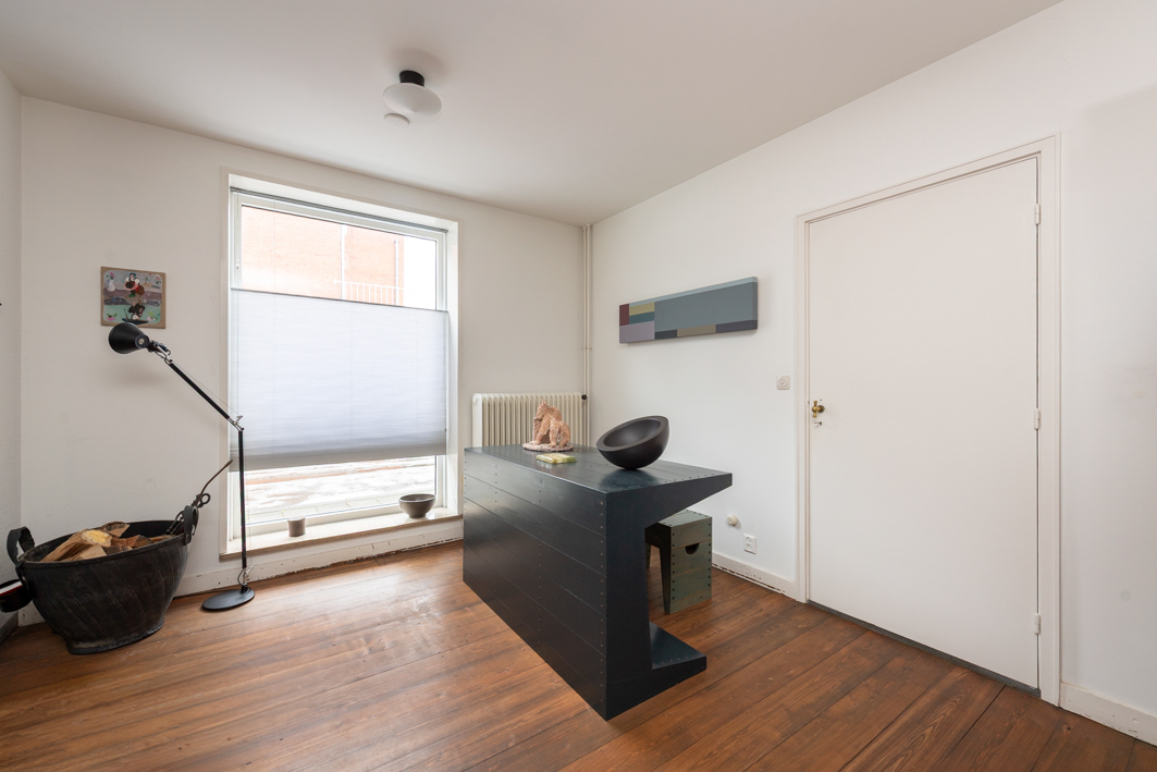 De trapkast in de woonkamer biedt niet alleen volop bergruimte, maar geeft ook via een luik in de vloer toegang tot de kruipruimte. Een houten bordes met twee treden in de hoek van de woonkamer leidt via een ‘verborgen’ rechte trap naar de eerste verdieping en benadrukt zo het architectonische karakter van het interieur.