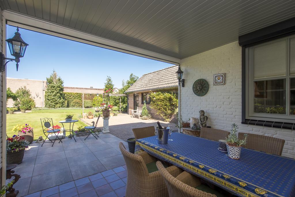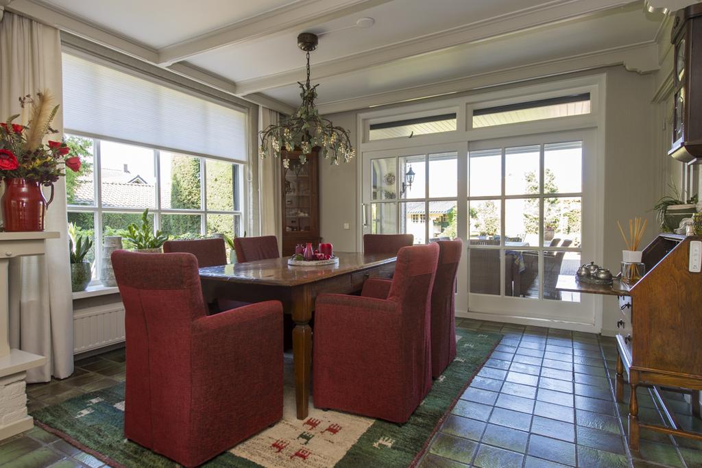 De royale L-vormige woonkamer met tegelvloer, een centraal gelegen schouw met open haard en een schuifpui naar het terras is afgewerkt met balkenplafond en deels gestuukte wanden. Er is veel lichtinval door de vele ramen met sfeervolle vakverdeling. Via de schuifpui toegang tot het knusse overdekte terras wat middels een screen kan worden afgesloten zodat er tot laat gebruik gemaakt kan worden van deze buitenruimte.