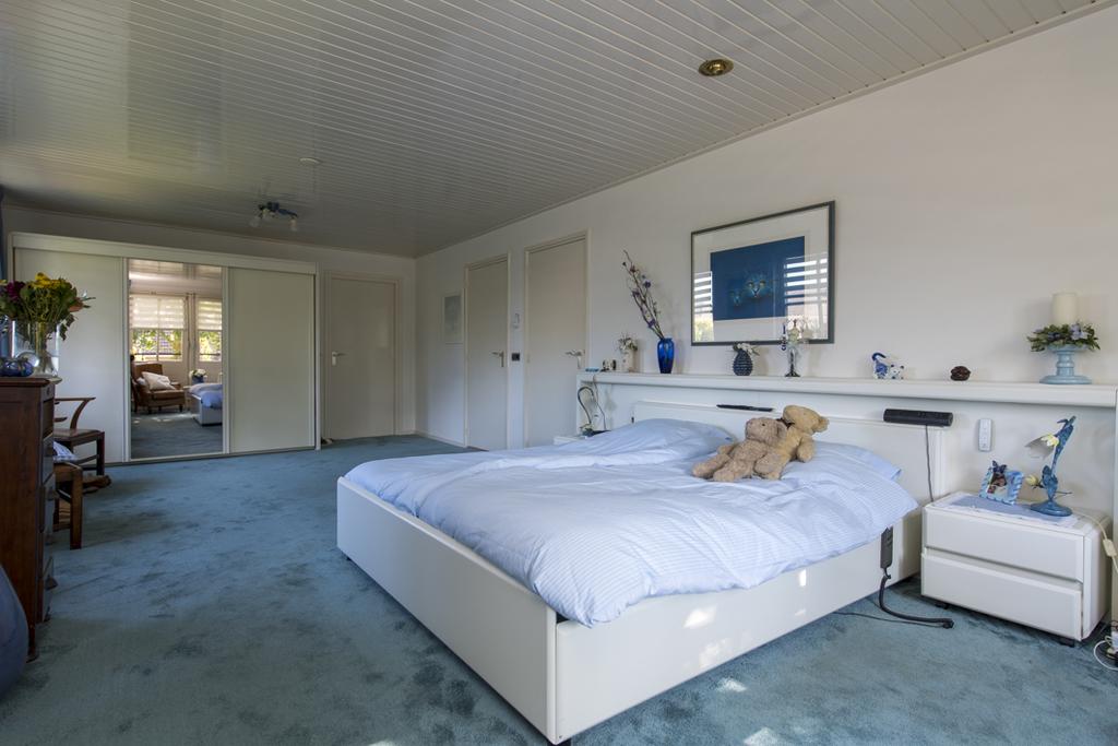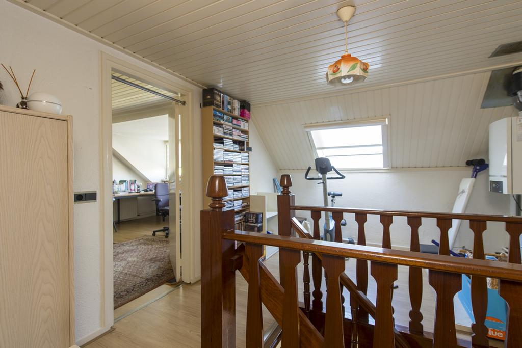 Overloop met trapopgang naar de 2e verdieping. Op deze verdieping zijn twee slaapkamers aanwezig, een werkkamer, veel bergruimte en de badkamer. De slaapkamer aan de voorzijde heeft een vaste kastenwand. De grote slaapkamer (mogelijkheid om twee slaapkamers te creëren) heeft toegang tot een kleding-/werkkamer en deze ruimte heeft een dakkapel. Vanuit deze ruimte toegang tot bergruimte onder de schuine kap.