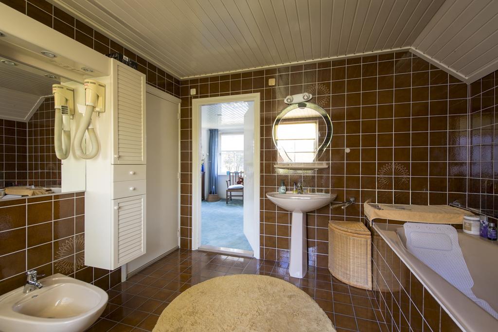 Royale badkamer met ligbad, douche in cabine, staand toilet, bidet en wastafel met vaste kasten. De badkamer is vanuit de slaapkamer en de overloop bereikbaar.