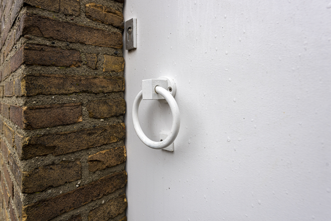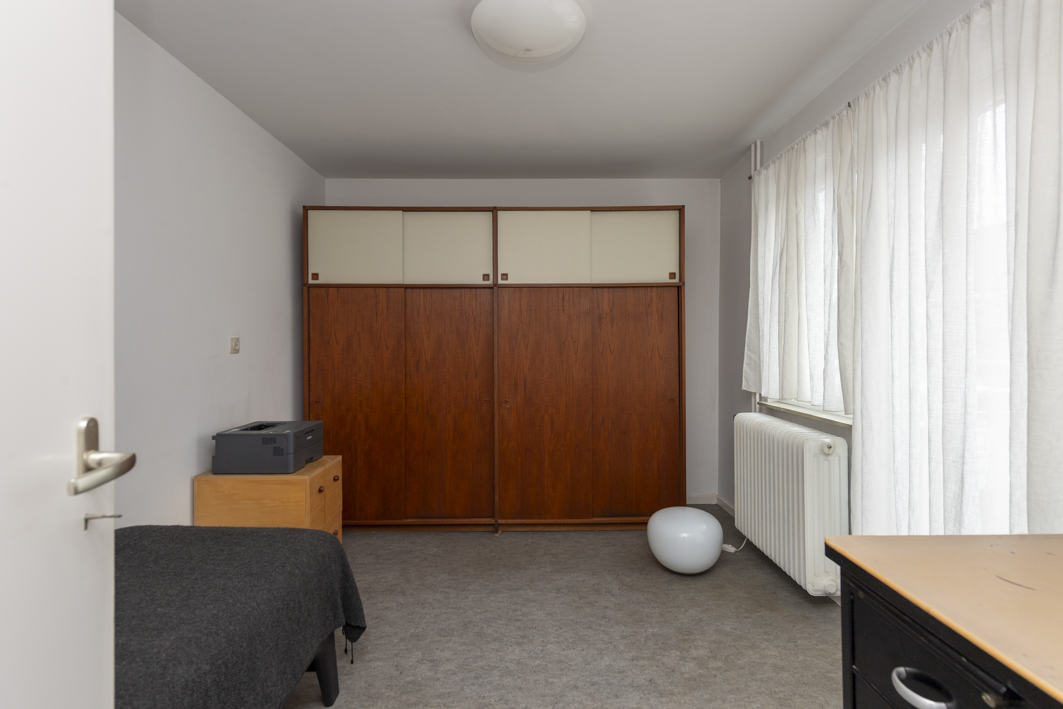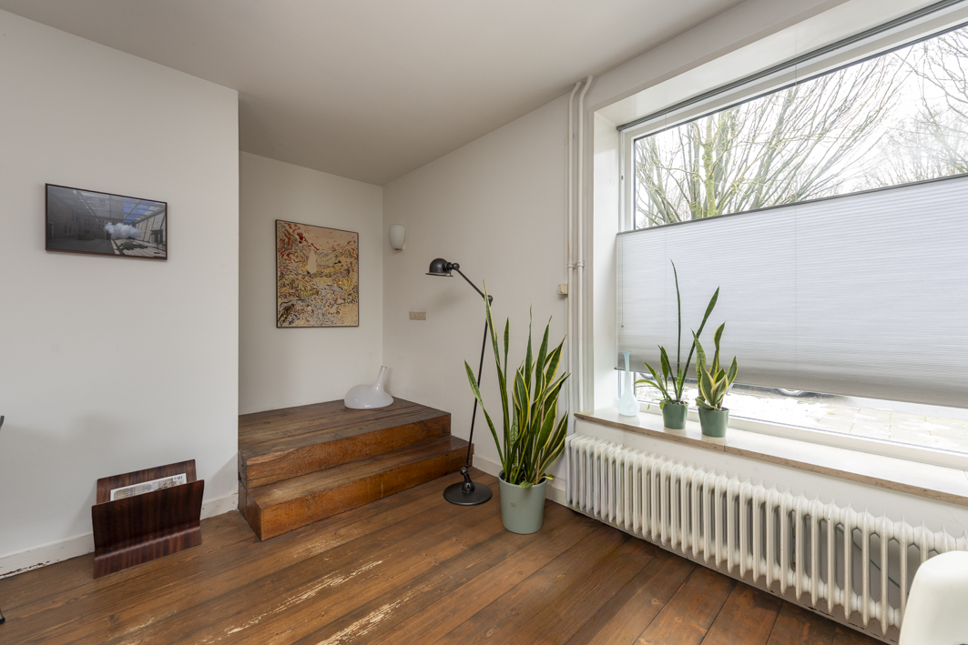 De trapkast in de woonkamer biedt niet alleen volop bergruimte, maar geeft ook via een luik in de vloer toegang tot de kruipruimte. Een houten bordes met twee treden in de hoek van de woonkamer leidt via een ‘verborgen’ rechte trap naar de eerste verdieping en benadrukt zo het architectonische karakter van het interieur.
