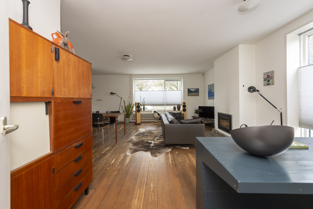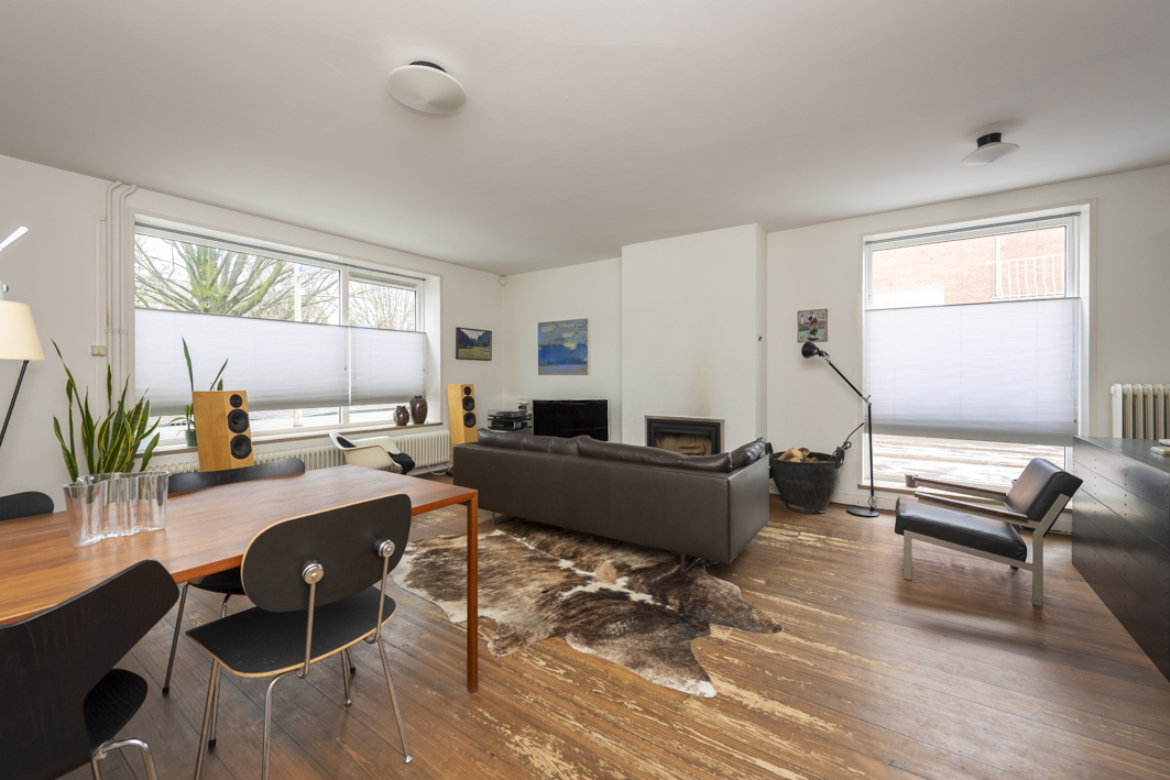 De lichte woonkamer (circa 35 m²) biedt een prachtig, vrij uitzicht over het Van de Mortelplein. De ruimte, met een plafondhoogte van 2,58 m, is afgewerkt met een houten vloer en strak stucwerk en beschikt over een sfeervolle schouw met inbouwhoutkachel. Karakteristiek zijn de twee grote raamkozijnen, met extra diepe vensterbanken, die iets buiten de gevel steken.