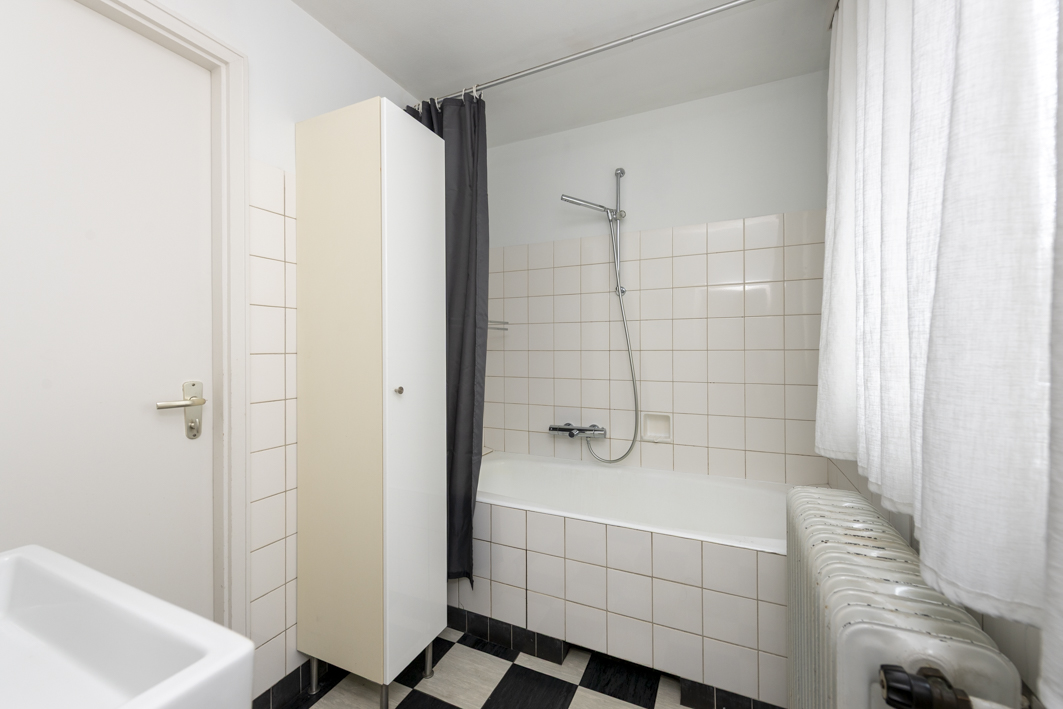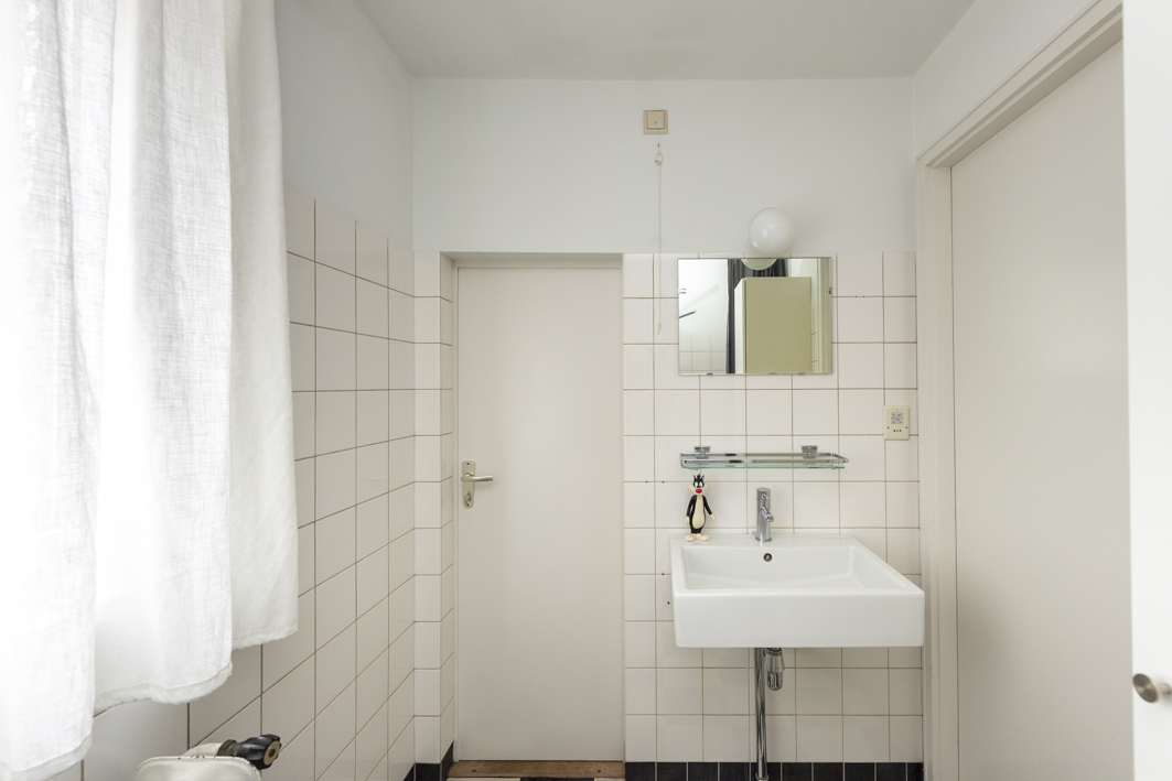 De eenvoudige, maar nette badkamer is voorzien van een ligbad met douche, een wastafel (Philippe Starck) met planchet en een smalle badkamerkast.