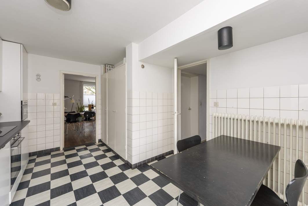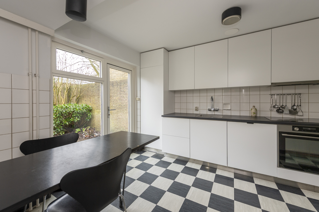Aan de achterzijde van de woning bevindt zich de gemoderniseerde woonkeuken (2020), een fijne plek om samen te koken en te eten. De woonkeuken is uitgerust met witte onder- en bovenkasten, een vaste eettafel, ATAG-inbouwapparatuur (inductiekookplaat, afzuigkap, oven en magnetron), een AEG was-droogcombinatie en een AEG-koelkast met groentelades en vriesvak. De LED-verlichting onder de bovenkasten en het donkergrijze composiet aanrechtblad maken het strakke keukenblok compleet. Vanuit de woonkeuken heeft u direct toegang tot de charmante tuin met borders.